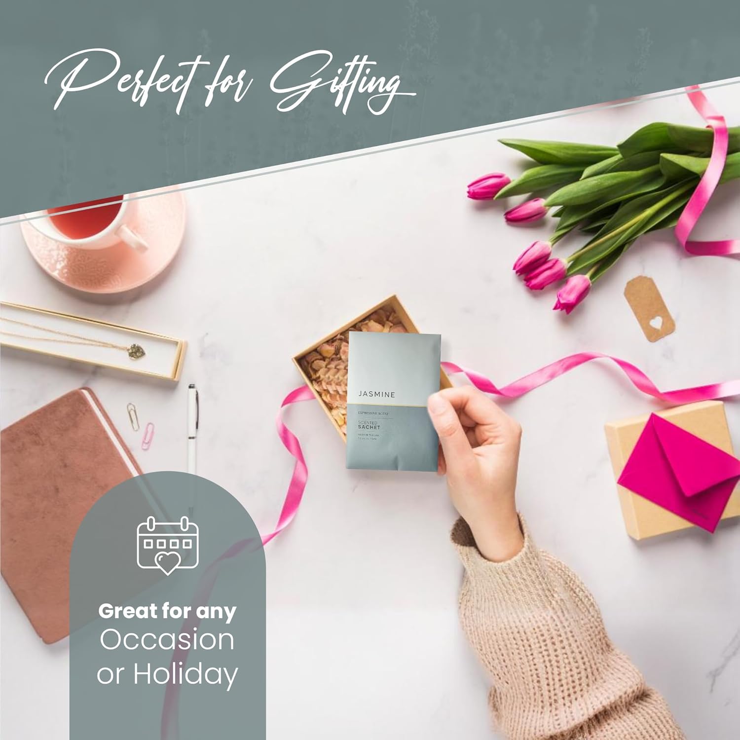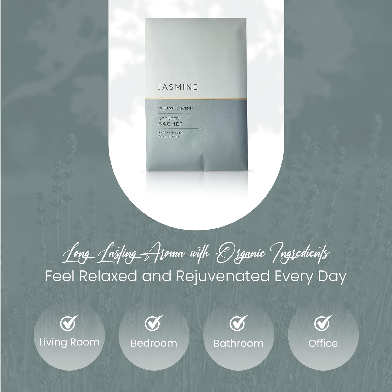 - LONG-LASTING AROMA: Experience a refreshing burst of fragrance with Jasmine Expressive Scent sachets meticulously crafted from a blend of organic ingredients. Designed to Infuse your spaces with a continuous Long-lasting aroma that revitalizes your environment. Perfect Jasmine Fragrance for small spaces such as drawers, closets and cars. Scented Sachets Air Fresheners keeps your surroundings fresh.