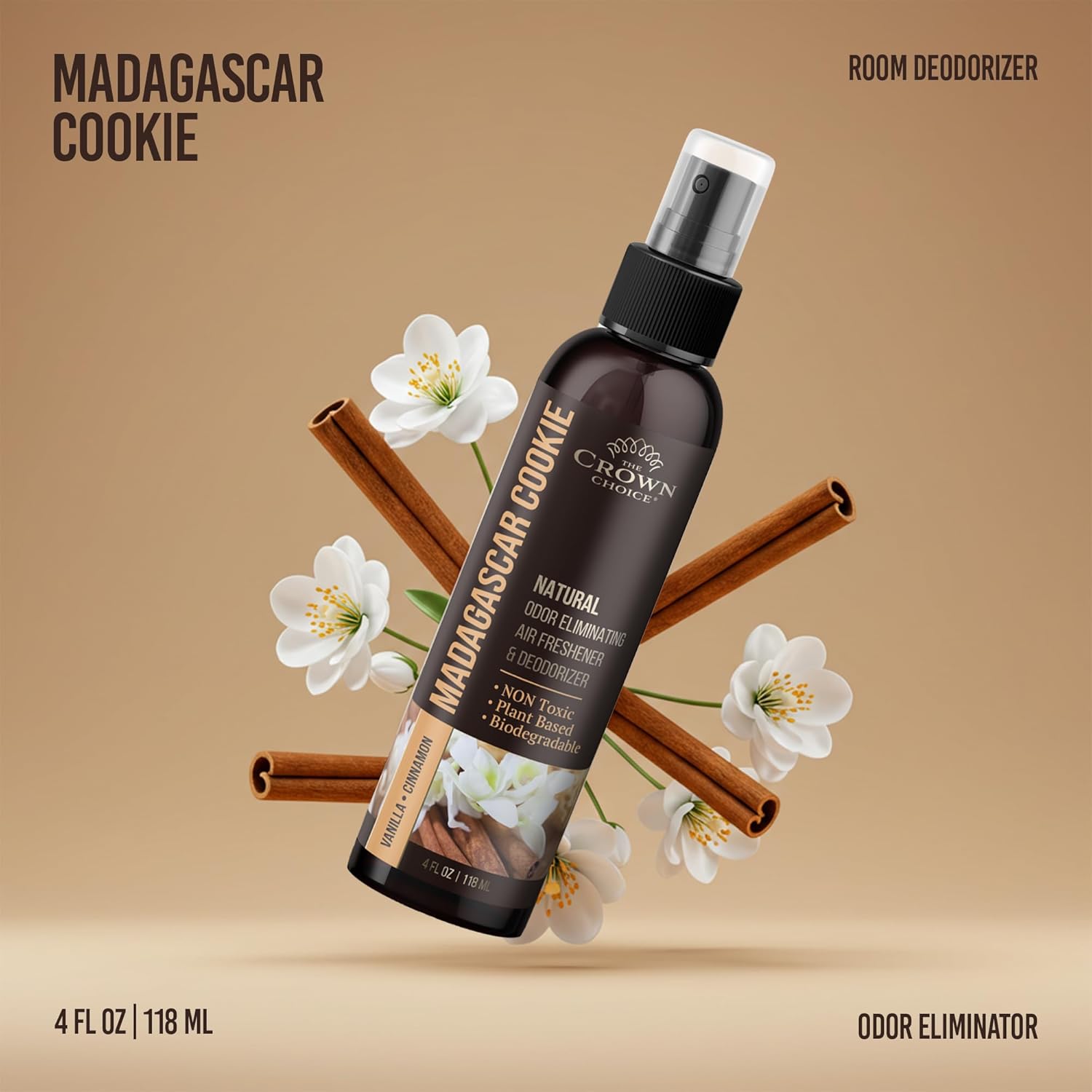 - ODOR ELIMINATOR FOR HOME WITH UP TO 200 SPRAYS The Crown Choice odor eliminator spray neutralizes strong odors from pets including cats and dogs, bathroom deodorizer, trash cans, and cooking. Each 4-oz bottle delivers up to 200 sprays of consistent freshness, making it a reliable dog odor eliminator for home, and room freshener spray.