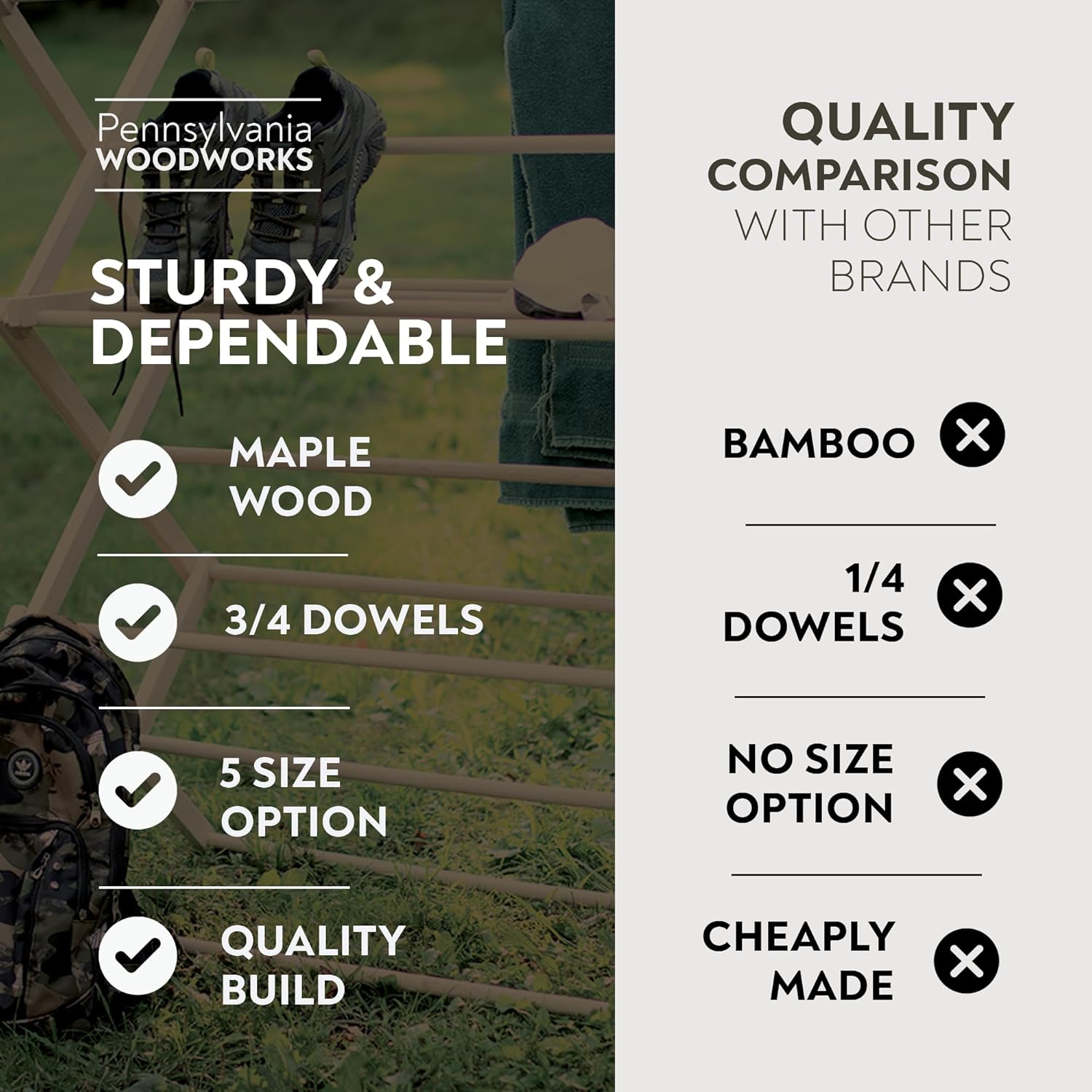 - Heavy-Duty Maple Hardwood: Forget flimsy bamboo & chintzy metal drying racks. This one comes in solid maple for rock-hard durability. Holds full loads of soaking-wet laundry without even wobbling.