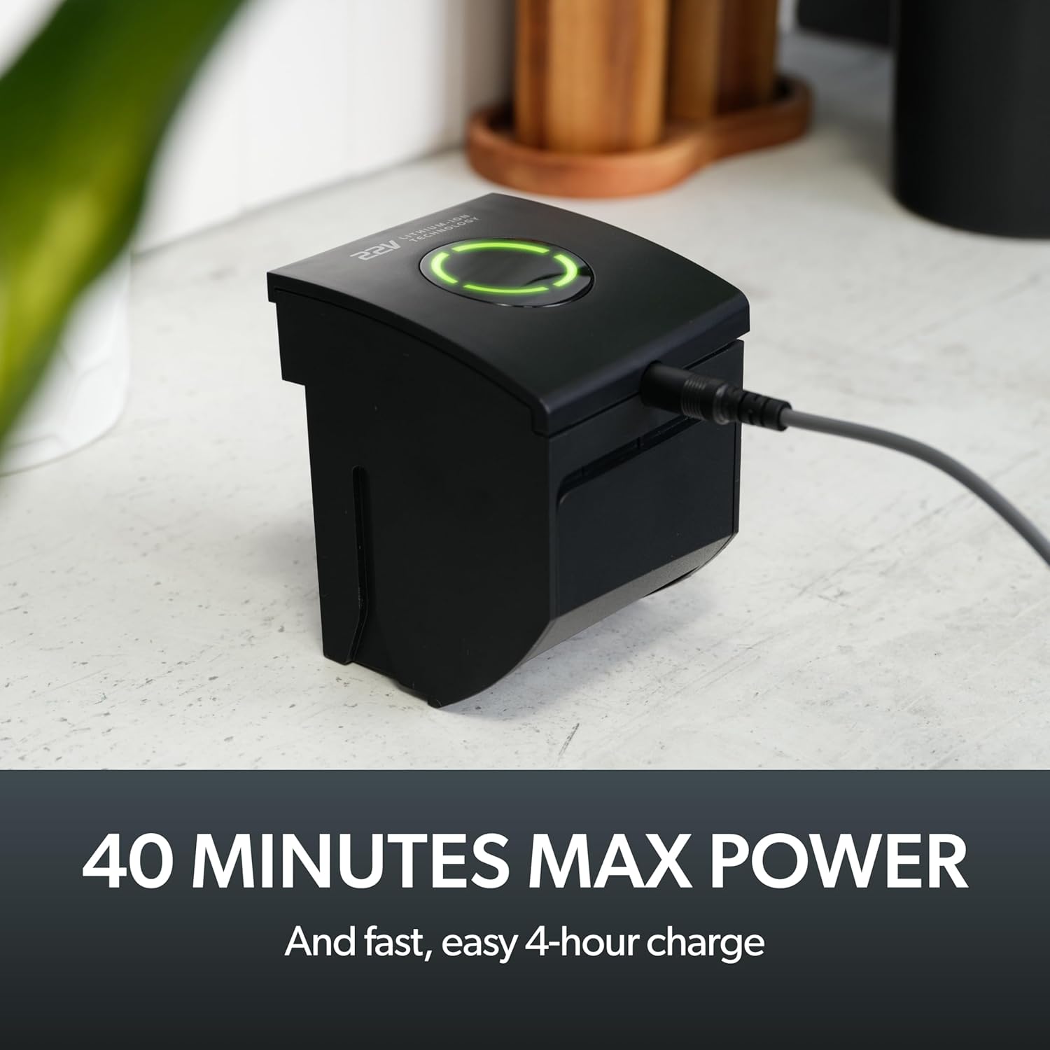 - RECHARGEABLE BATTERY: Powered by a 22V lithium-ion battery, the AirRAM 2 K9 provides up to 40 minutes of runtime after a 4-hour charge. The 4-stage LED indicator on the back of the vacuum gauges how much charge remains.