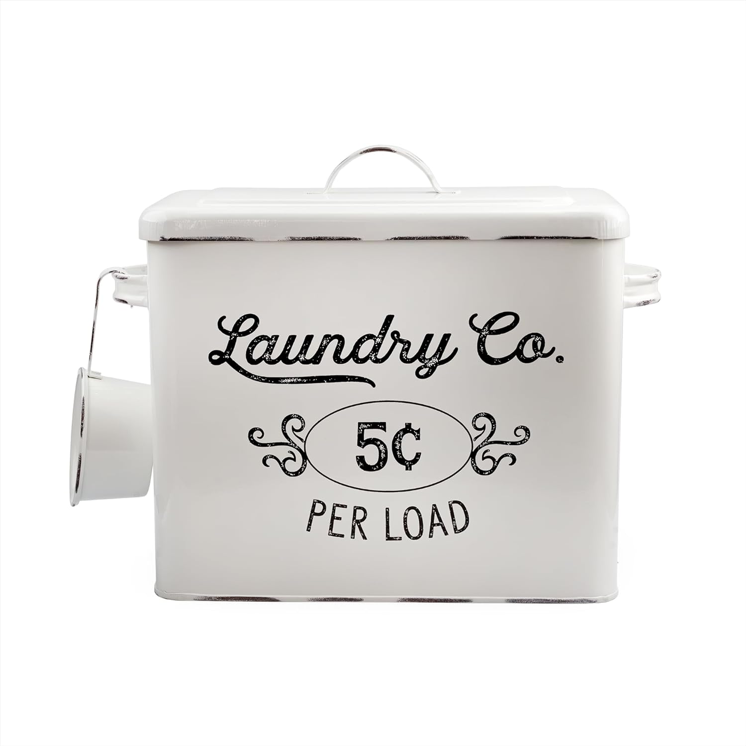 AuldHome Design Farmhouse Laundry Powder Container, White Enamelware Detergent Bin w/ Scoop