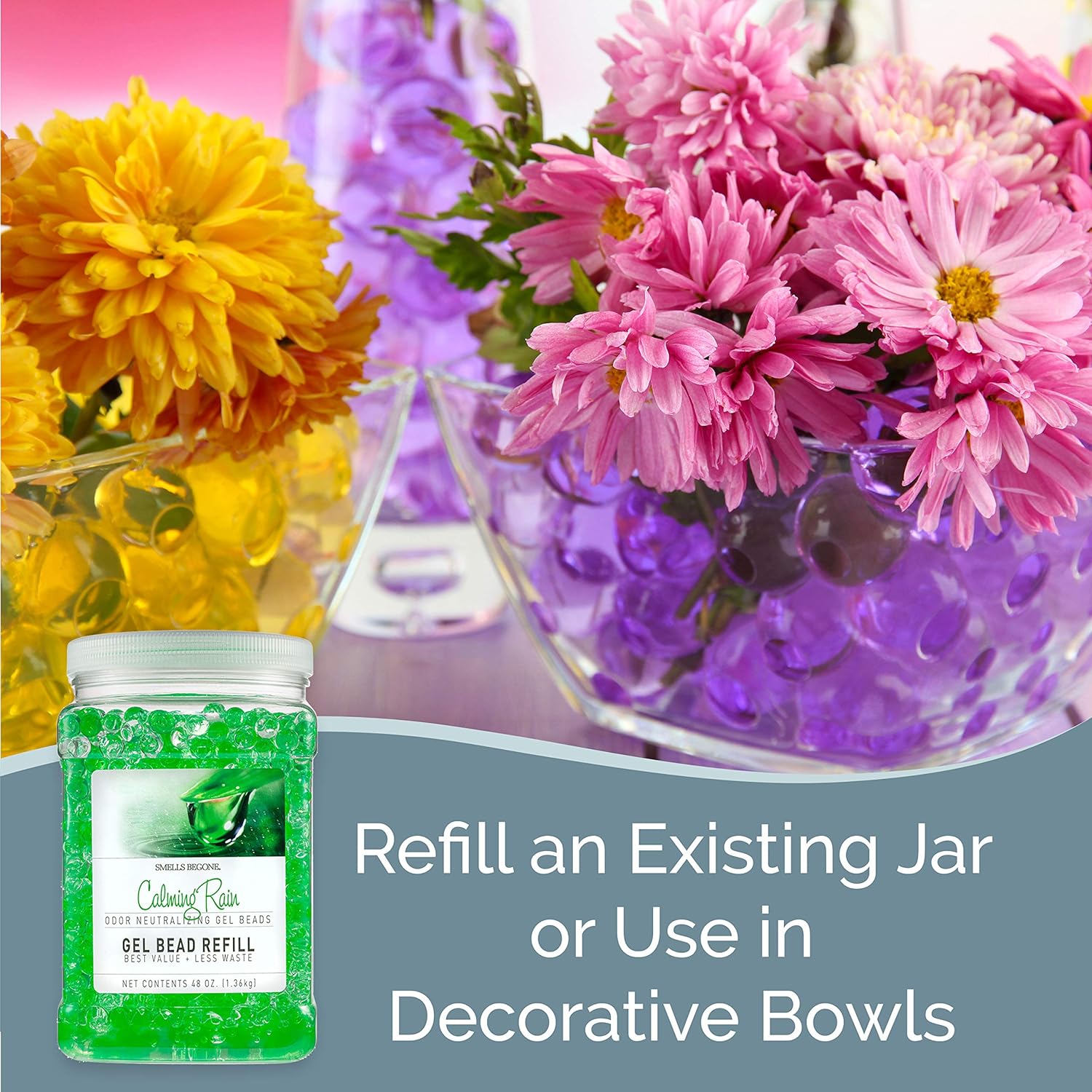 - MADE WITH ESSENTIAL OILS - Each Odor Eliminator Gel Bead jar contains 12 ounces of product and the larger refill jar contains 48 ounces of product. The products are made with plant derived ingredients and formulated with a blend of essential oil based fragrances which adds a distinct and unforgettable aroma to any area you place and use the jar.