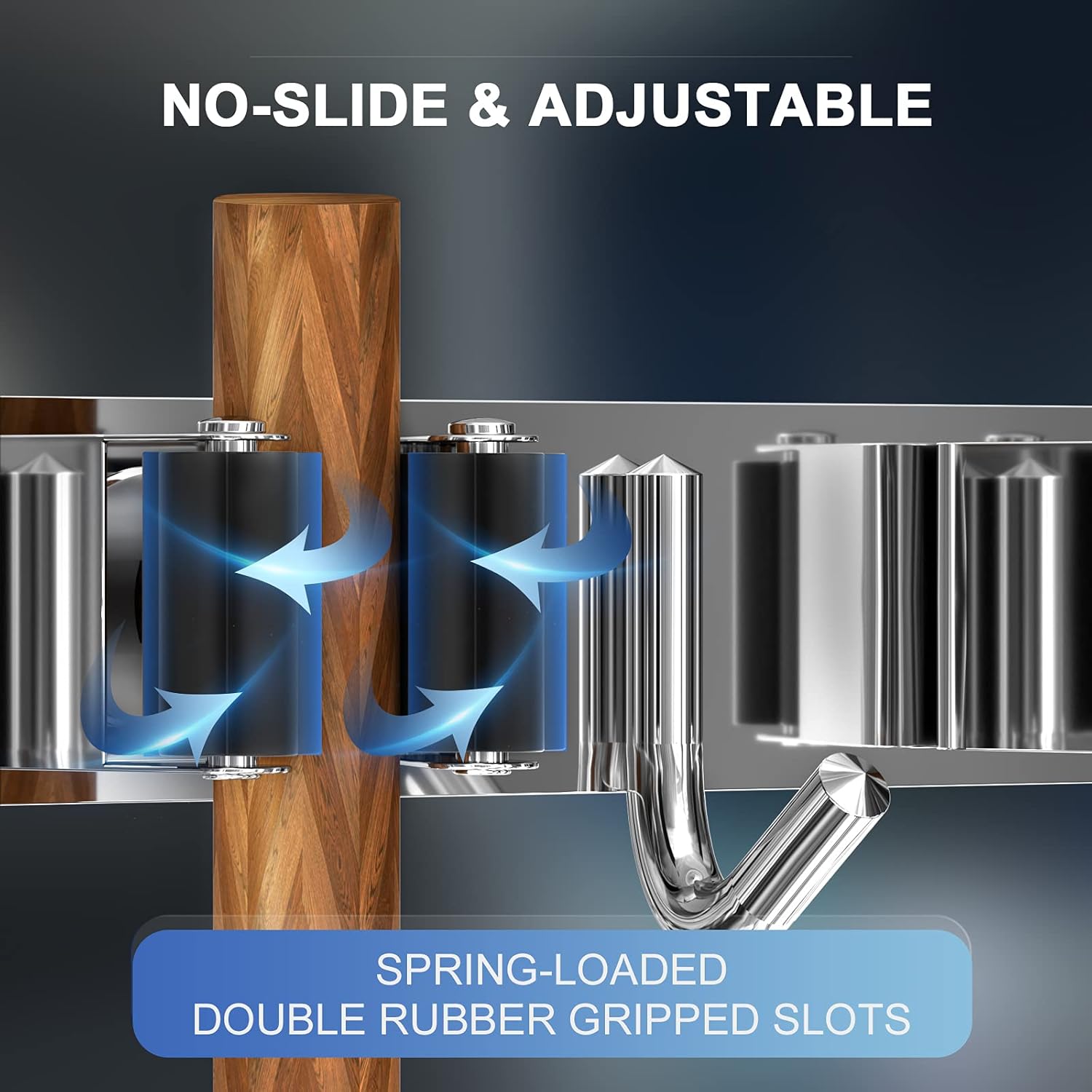 - 🏡【NON-SLIDE DESIGN】Each rack of the broom and mop holder wall mounted features an adjustable triangular design. The spring-loaded, double rubber gripped slots can keep a stronger hold on your items with diameter of 0.7 inch-1.3 inch. Whether wet mops or baseball bats, nothing slips.