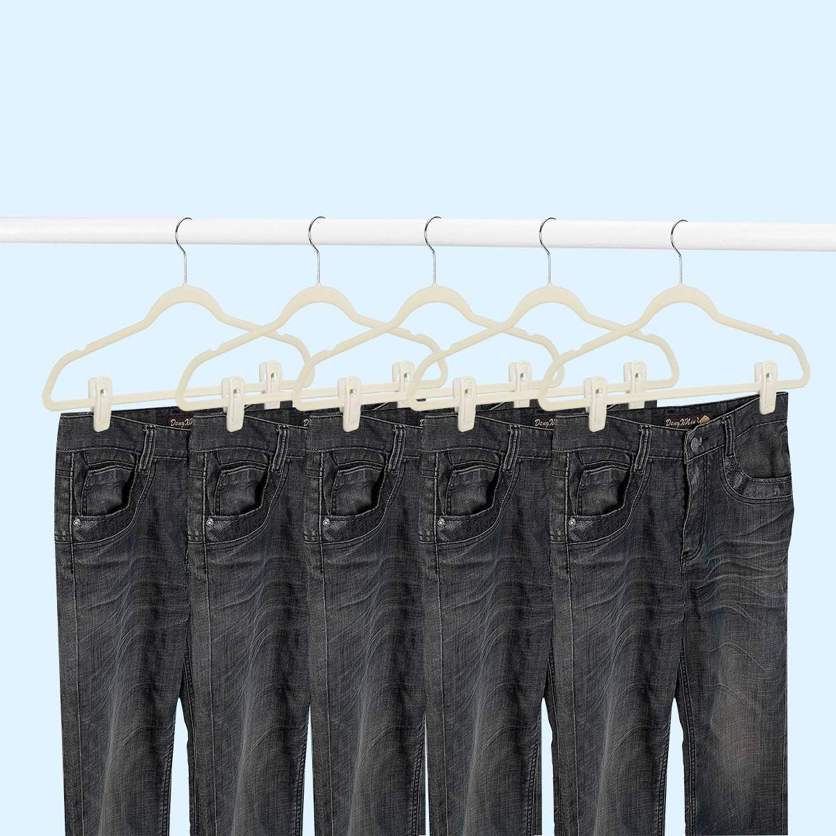 - ā High-quality material: These hanger clips are made of PP material and covered with high-grade soft beige velvet. It is very sturdy and durable. The beige velvet hanger clips of 60packs can be easily matched with velvet hangers of any color and size. It looks very elegant and beautiful.