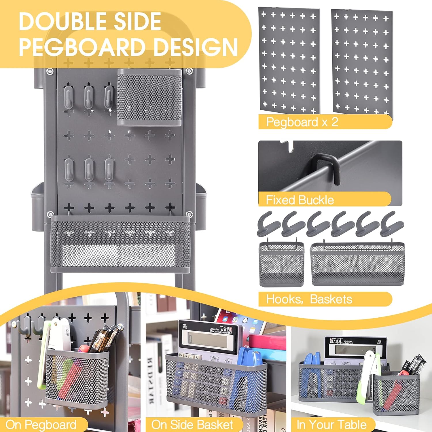 - 💦EXPLORE THE MATERIAL for DURABILITY | This serving dual pegboard cart is well constructed with high quality material, structured with heavy sturdy frame and sleek powder coated finiah which is anti-rust. The better weight capacity for each shelf is up to 44 LB. As well as its mesh basket hollow design also has breathable function.