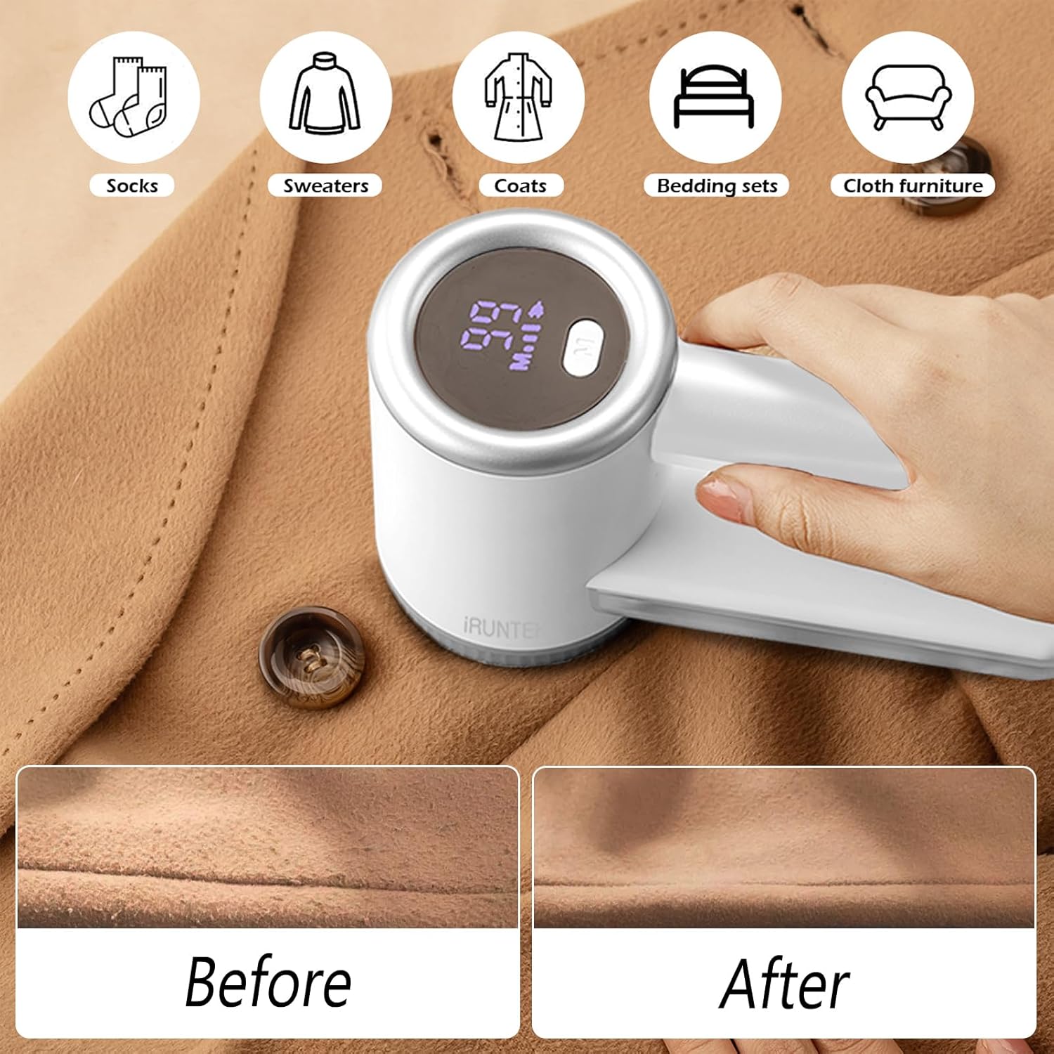 - ā LED DIGITAL DISPLAY: Fabric shaver using high-tech LED display, can be seen clearly of the battery power and speed gear on the screen, when the digital dispaly below 10, it need recharged, convenient and intuitive (Tips: Charging with 5V/1A adapter head)