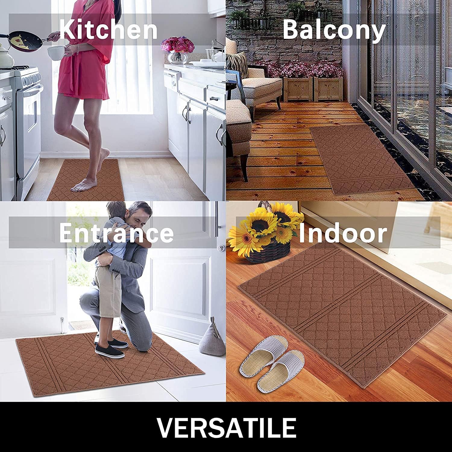 - 【LOW-PROFILE DESIGN & VERSATILE】Our inside door mats is only 0.4 ultra-thin inches, so doors can sweep over easily, ideal for low clearing doors or entryways. Low profile design and reinforced overlock edges ensures that doors won't get stuck or the door rug go curling. Ideal choice for your back door, kitchen, laundry, office, patio, living spaces and more. Boosting your home's overall beauty. Which is also ideal as a gift for your friends, parents, kids and family.