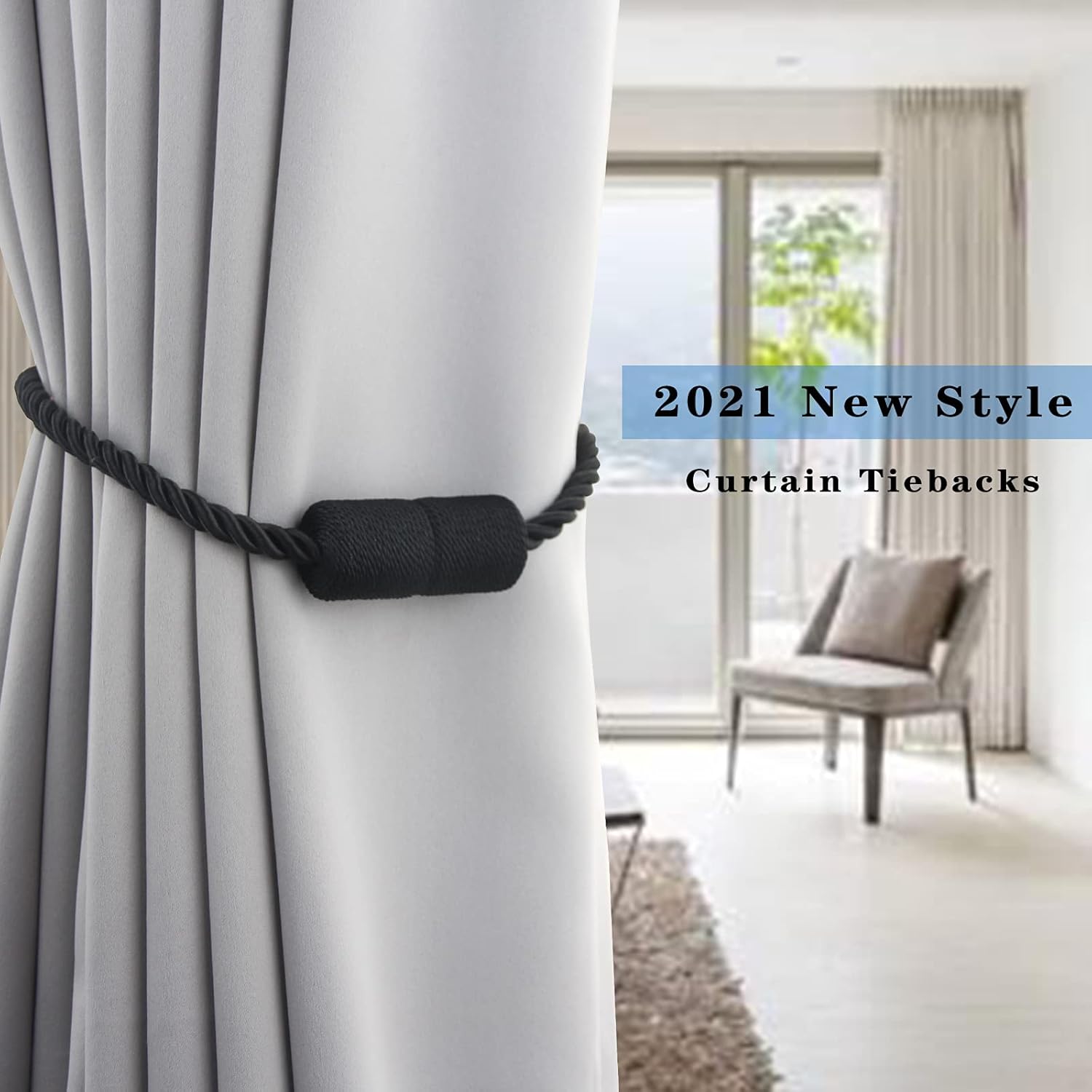 2 Pack Black Strong Magnetic Curtain Tiebacks Outdoor Elegant Decorative Tie Backs Modern Rope Tiebacks for Drapes Window Curtain Holdbacks for Draperies