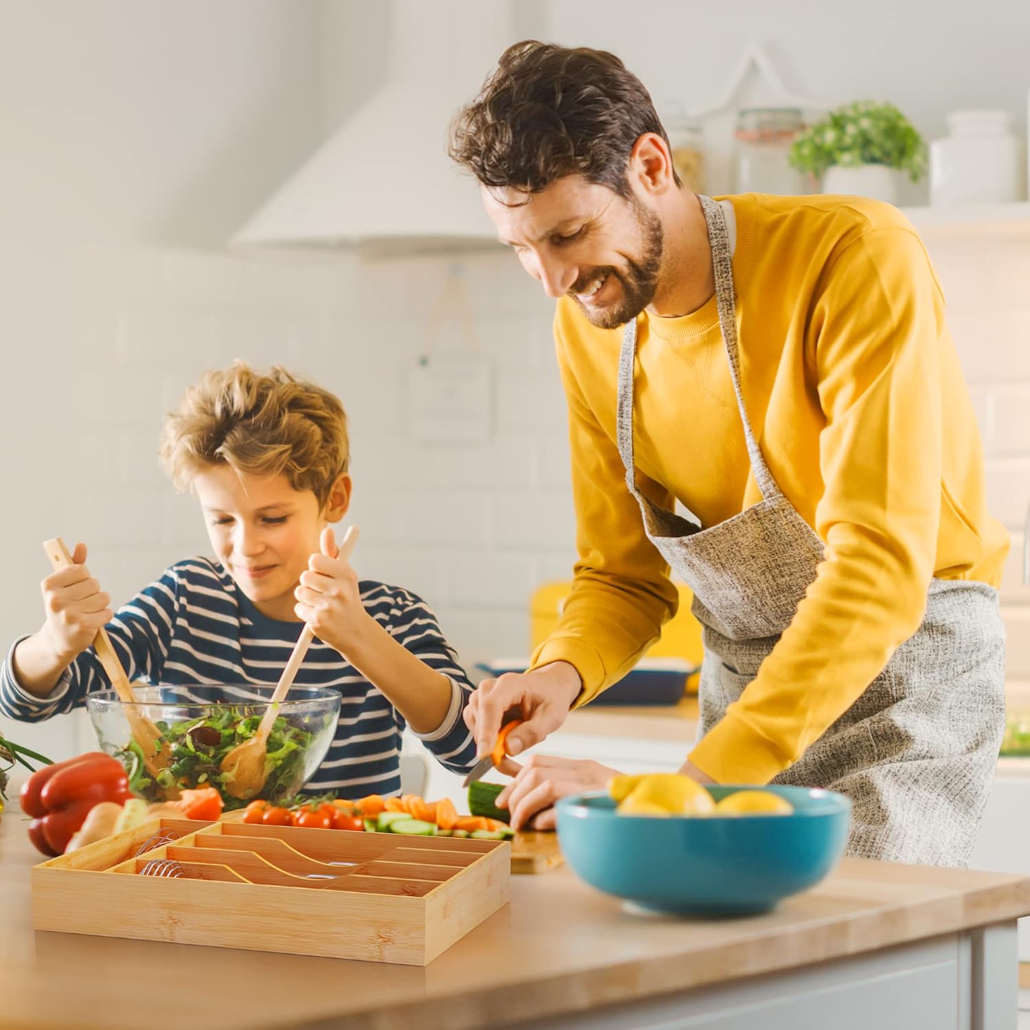 - ăMade of natural bambooăOur flatware organizer is made of natural bamboo. The material is taken from bamboo that have grown for more than 4 years which make our silverware holder for drawer use a durable kitchen piece that ll last you for years. The Environmentally material keep our flatware & utensil water and odor resistant. Even the knife won't leave scratch on it.