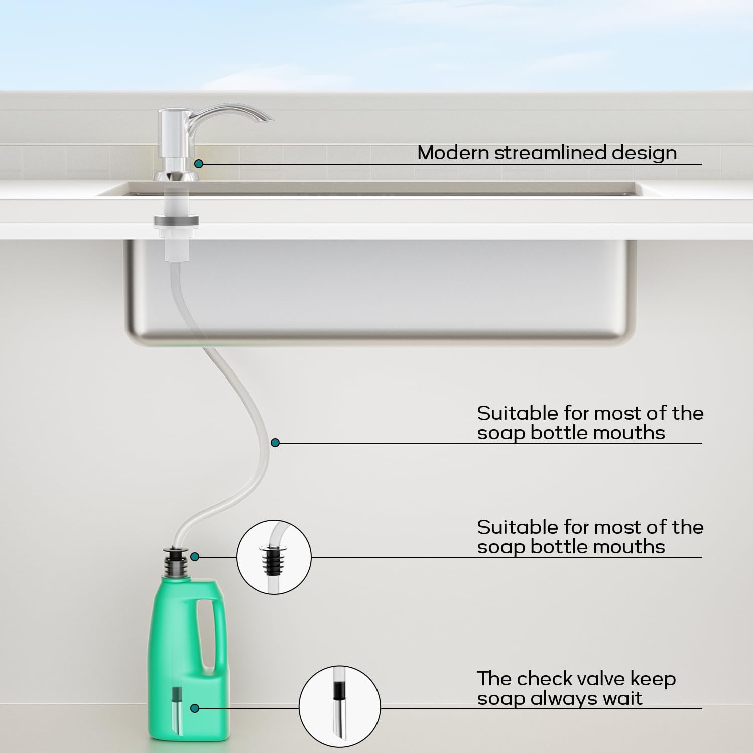 - ăInnovative Designă- The dispenser's metal check valve guarantees the tube stays submerged at the container's bottom, providing consistent suction for liquid soap, lotion, or detergent, ensuring soap dispenses with every push.
