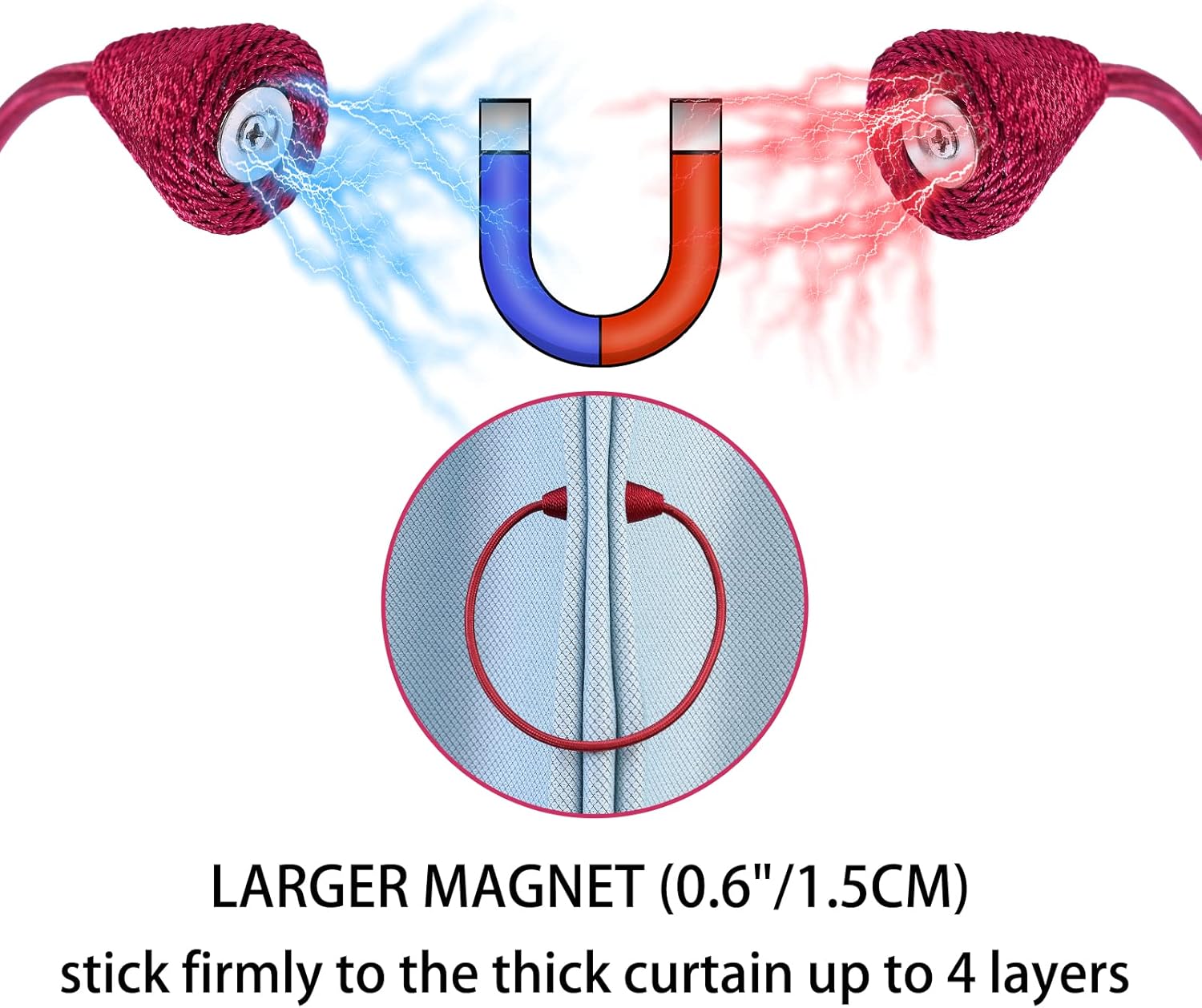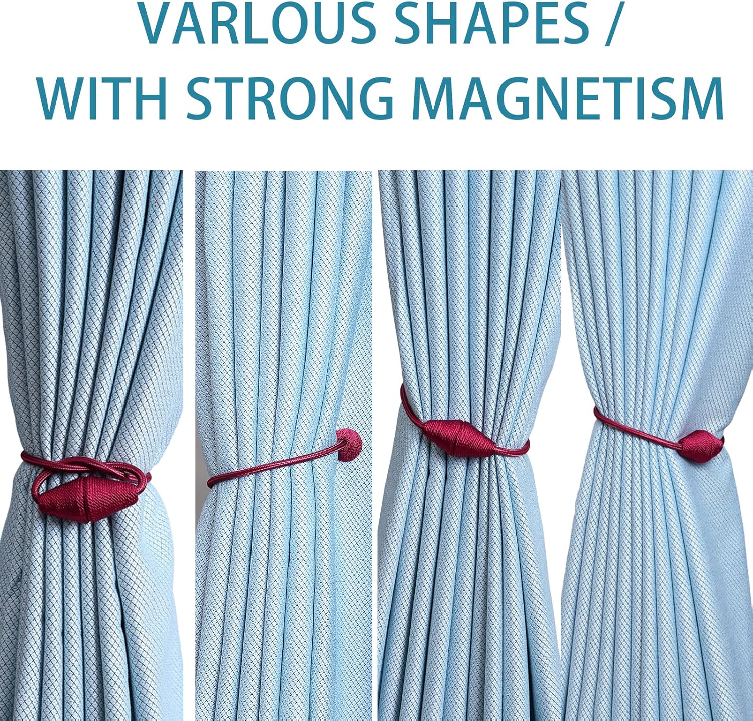- WIDE APPLICATION: The length and binding method can be adjusted freely according to the thickness of the curtain. It is widely used in curtains in different places such as bedroom, living room, dining room, bathroom, kitchen, office, courtyard and so on. Different colors of magnetic drape tiebacks adorn your curtains, which can change different styles, giving the curtains a unique charm