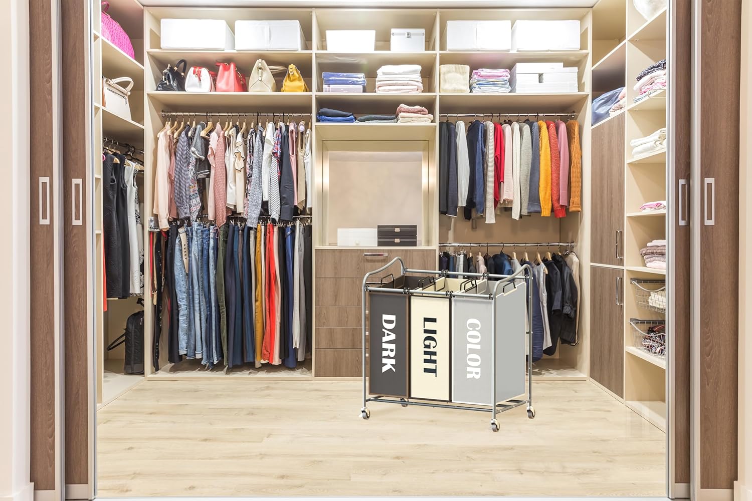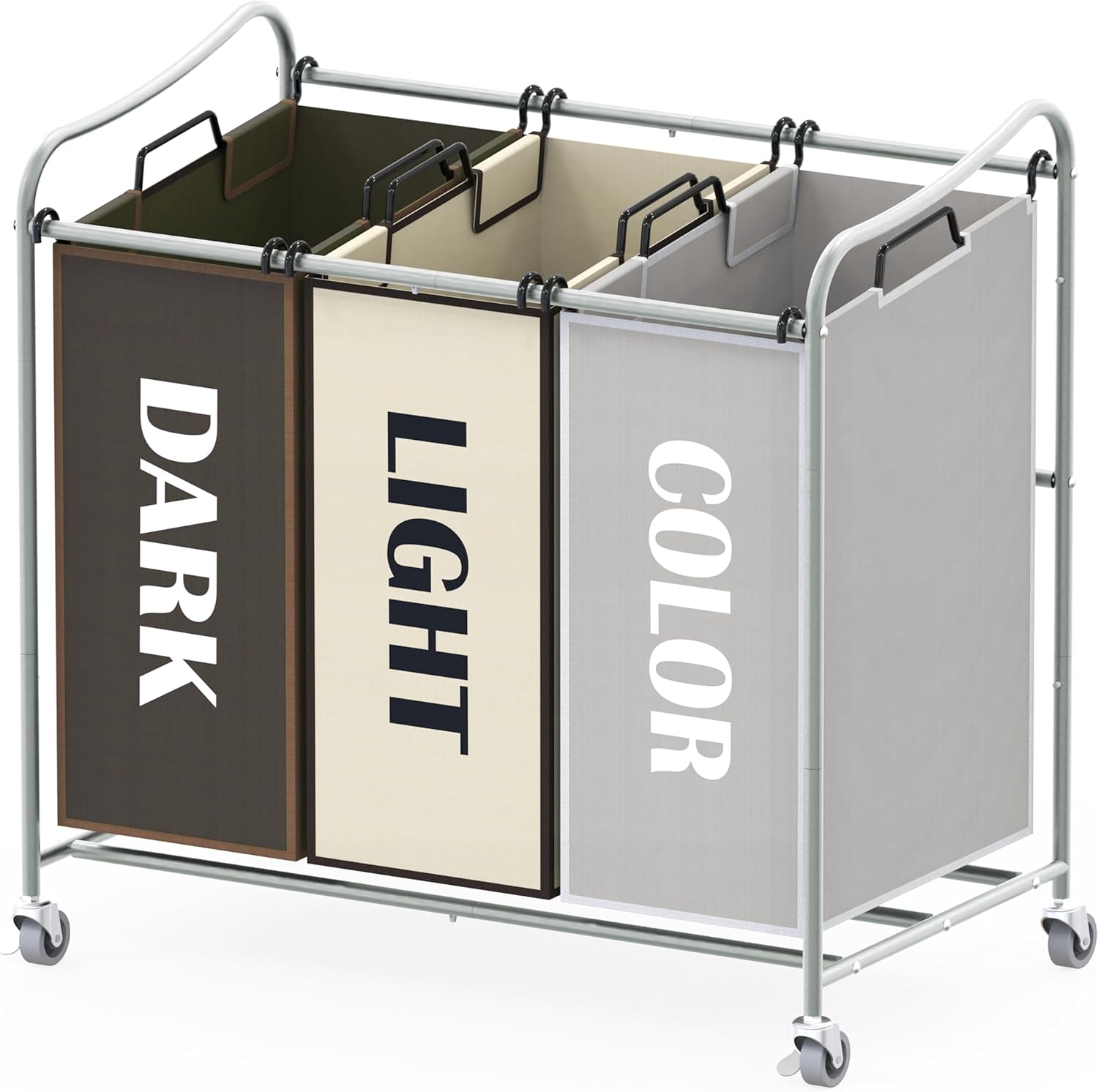 Simple Houseware Heavy Duty 3-Bag Laundry Sorter Rolling Cart, Silver/Assorted – Durable Triple Laundry Hamper with Removable Bags and Lockable Wheels for Laundry Room Organization
