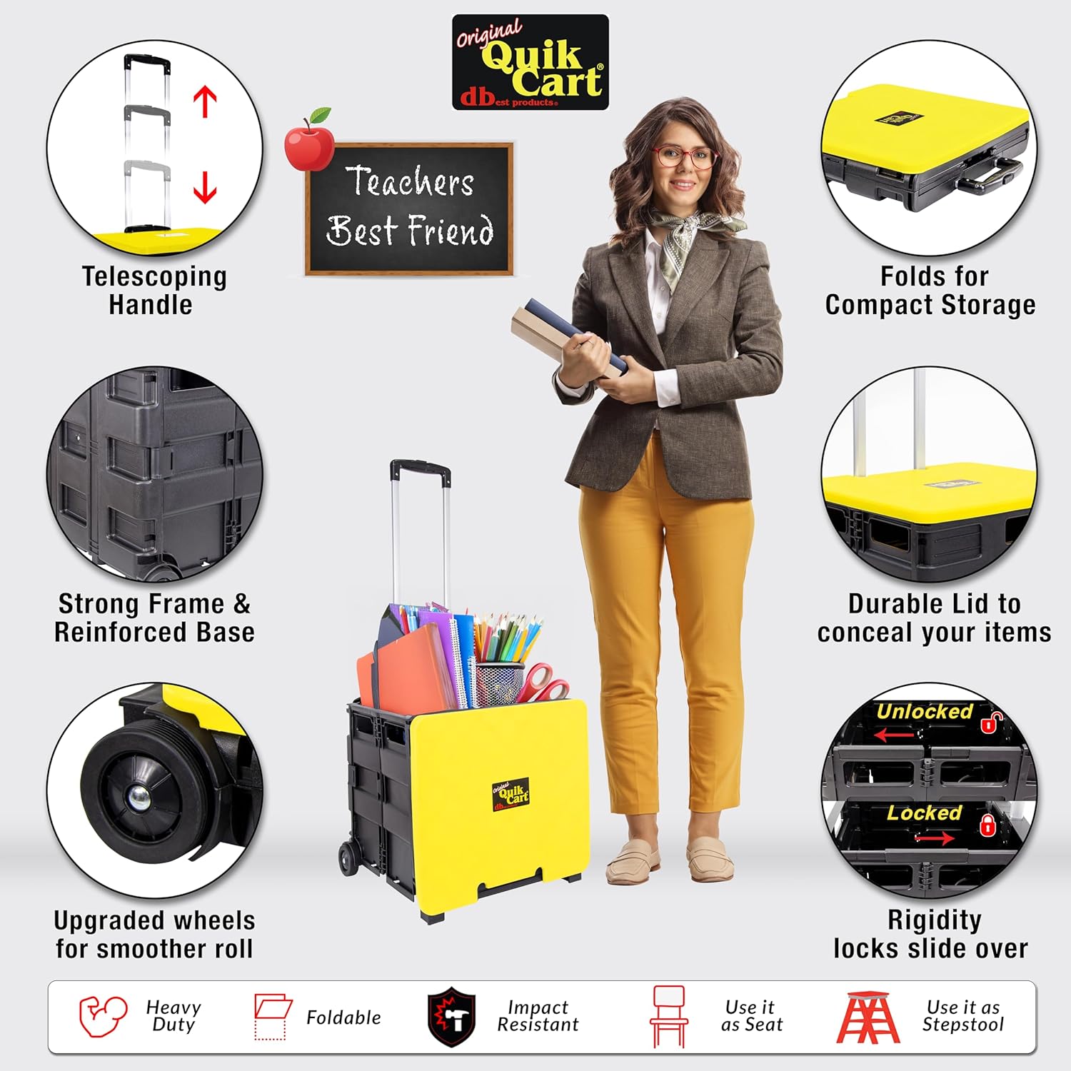 dbest products Quik Cart Collapsible Rolling Crate on Wheels for Teachers Tote Basket 80 lbs Capacity, Made from Heavy Duty Plastic and Used as a Seat, Canary, Yellow