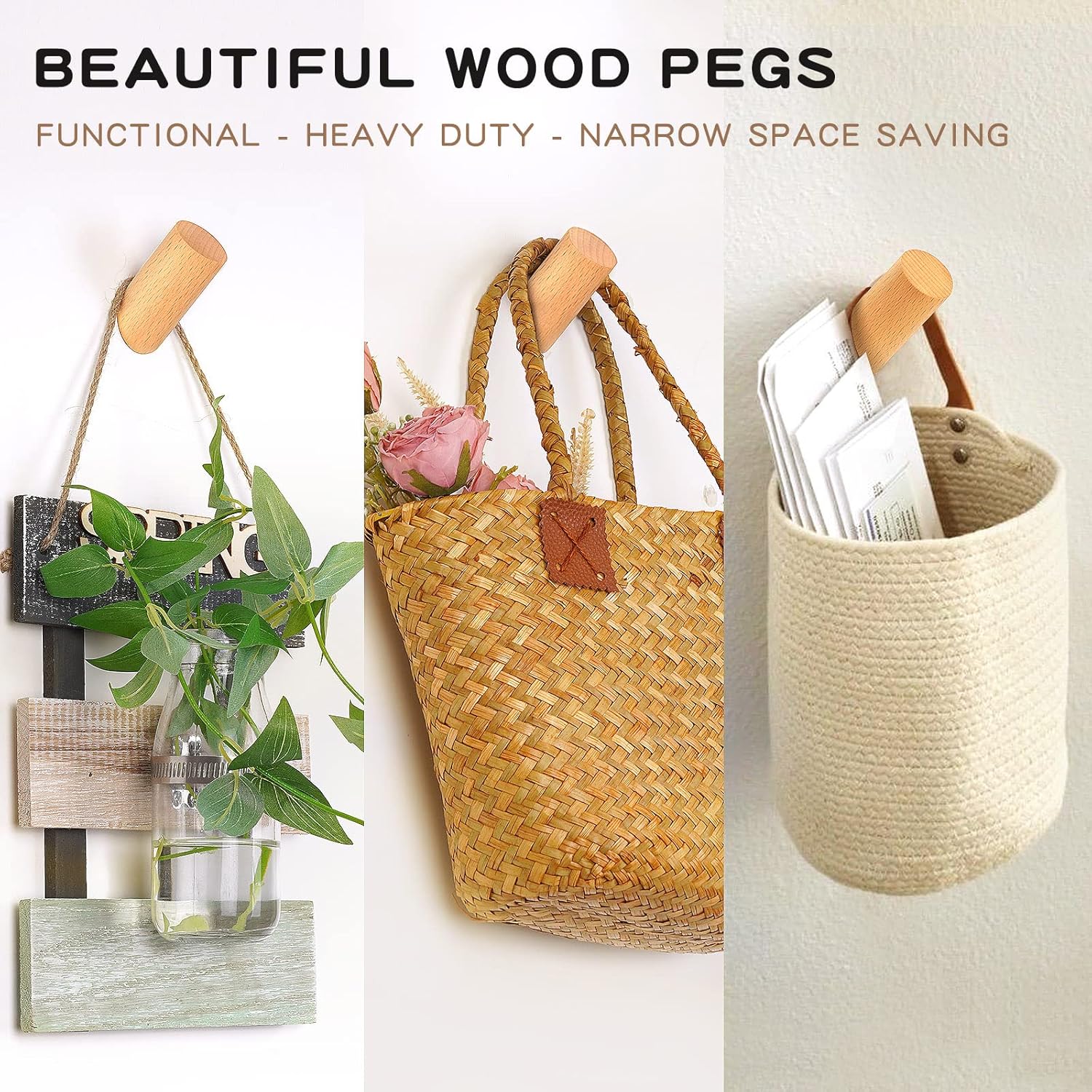 - DECORATIVE WOODEN HOOKS β Our wood wall hooks with natural wood grain and nice finish, add a touch of rustic beauty to your entryway, living room and bedroom. Hang coats and bags in the entry way, hang towels and robe in the bathroom, hang ukulele or plants in the hallway. Such a simple wood hook matches any dΓ©cor well from modern, rustic, minimal or Scandinavian