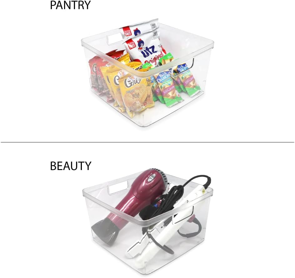 - CLEAR DESIGN: Staying organized is easy with these modern, clear plastic bins. The cutout handles make it easy to hold and carry from room to room. The transparent design of each bin enables you to quickly see what’s stored in each container; ideal for when you’re on-the-go. These modern bins are designed to blend into the décor of any room while cleaning up the mess on your desk, closet shelves, counterspace and tabletops. [Dimensions of each bin: [10” L x 10” W x 6.1” H]