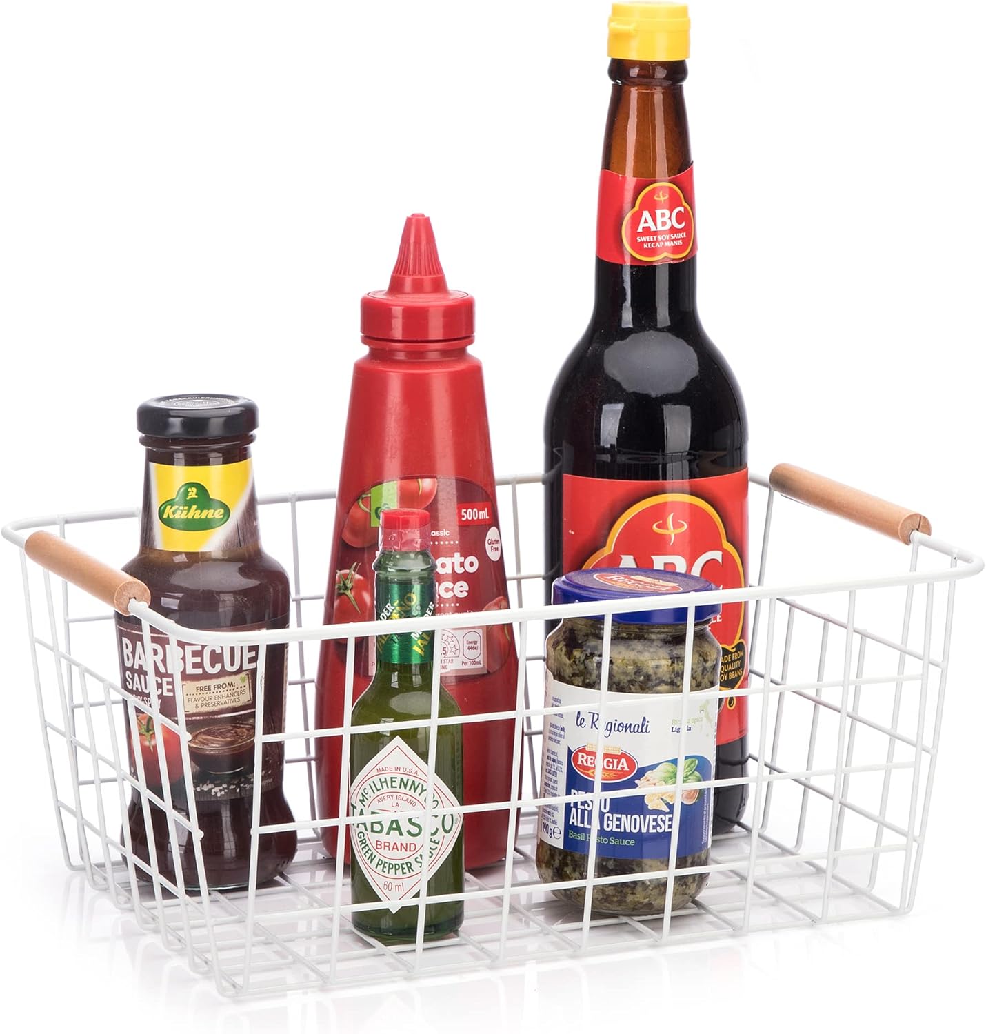Metal Wire Food Storage Basket Organizer with Wooden Handles for Organizing Kitchen Cabinets, 2 Packs-White