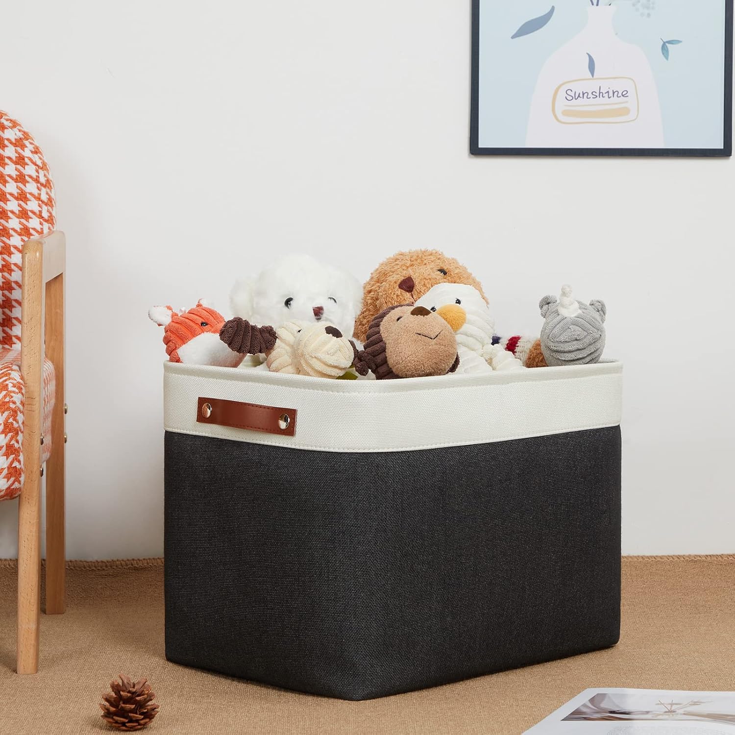 - 【Sturdy & Resistant】--- Set of 2 , dimensions(each): 16(L) x 12(W) x 12(H) inches. Premium Materials, resistant and has no odor. The leather handles and metal iron buckles are sturdy.The sturdy handles make fabric storage baskets easy to carry or pull off and out of shelves.