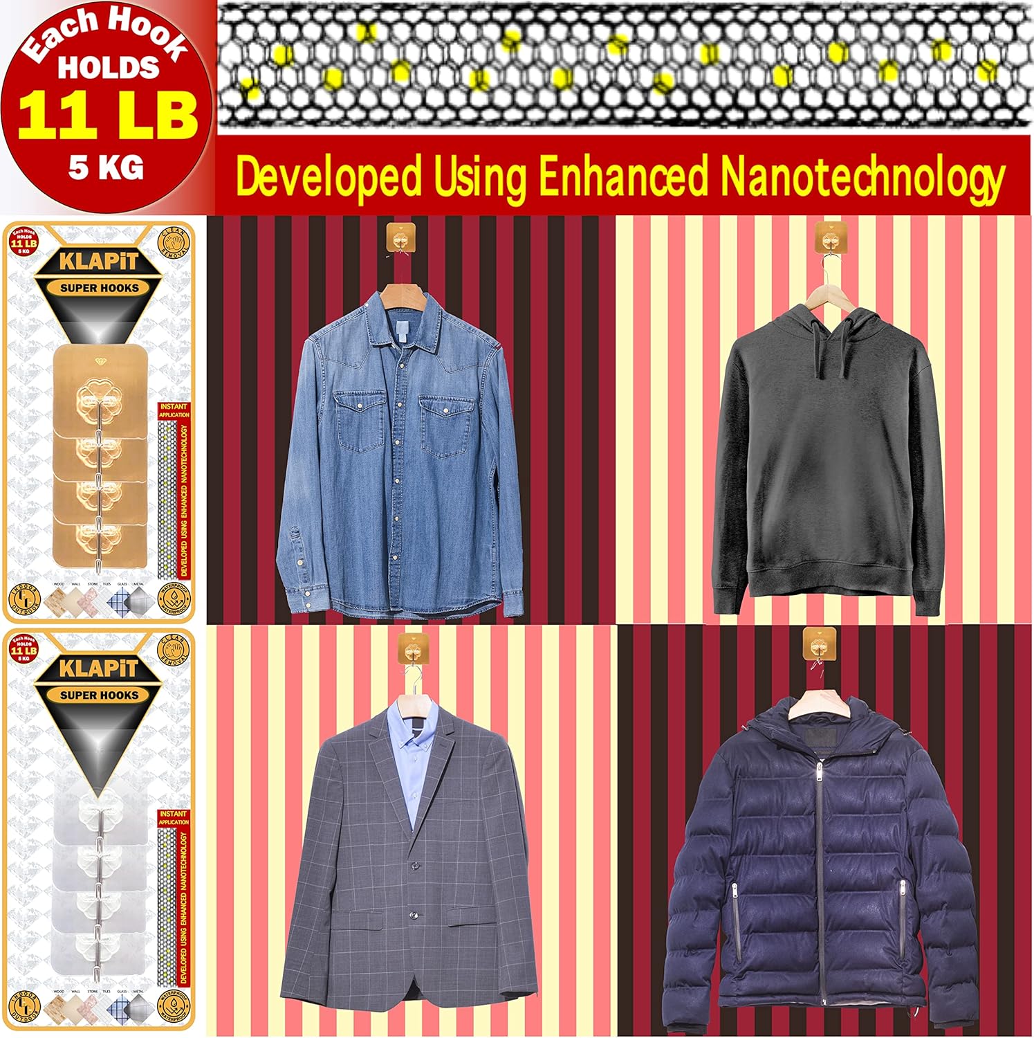 - Instant Use Technology: Skip the wait with KLAPiT SUPER HOOK’s Enhanced Nanotechnology adhesive. Simply apply to any surface and start hanging immediately—perfect for busy households.
