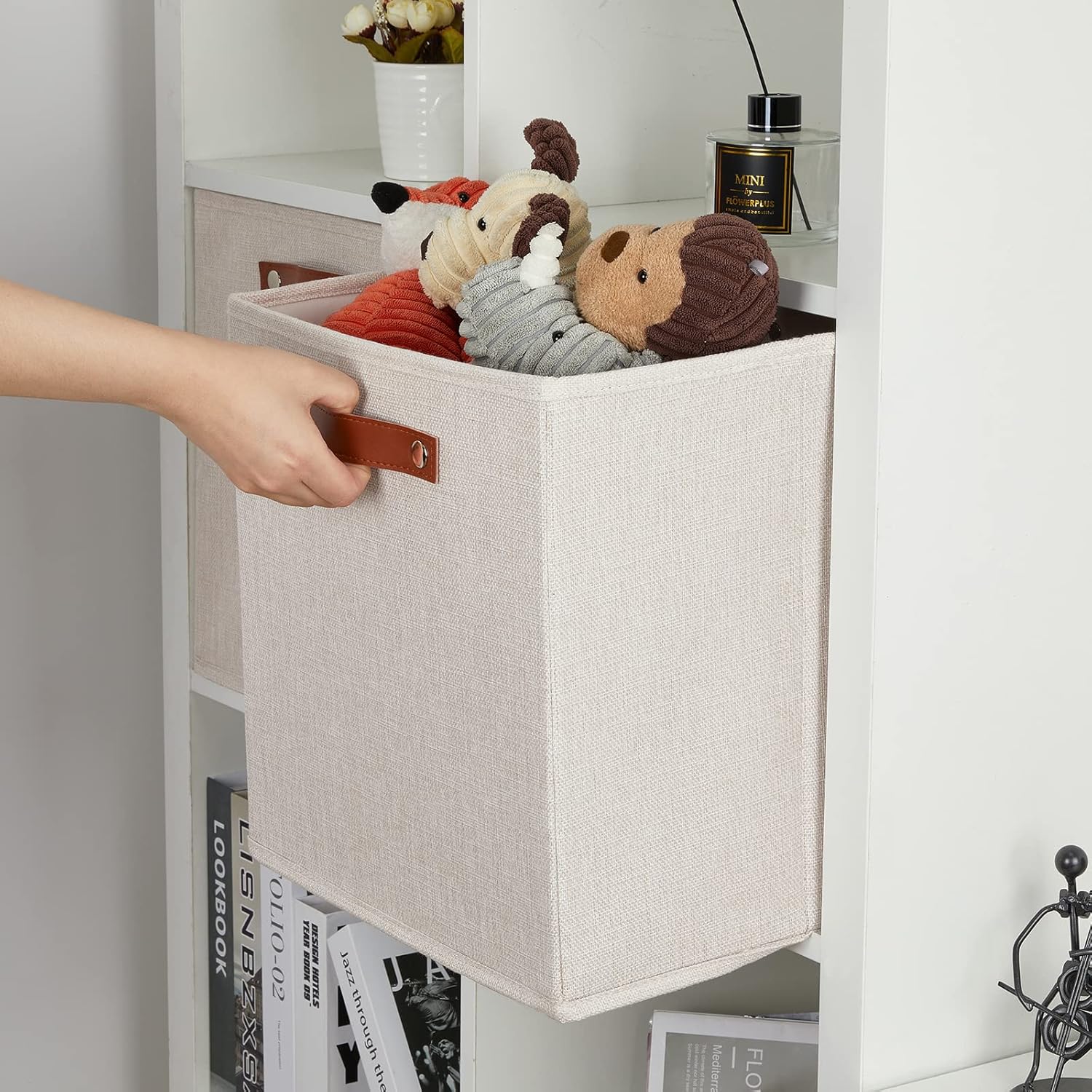 - 【Material】These cube storage bins are constructed of sturdy and attractive linen & cardboard with linen interior lining. The sturdy leather handles make it easy to carry or pull off and out of shelves.