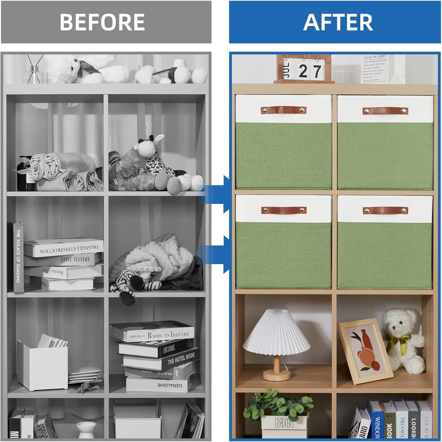 - SOFT STURDY PU HANDLES: The sturdy leather handles in front of canvas bins make transport a breeze. Convenient and sturdy attached handles make these green storage cubes easy to pull in and out.