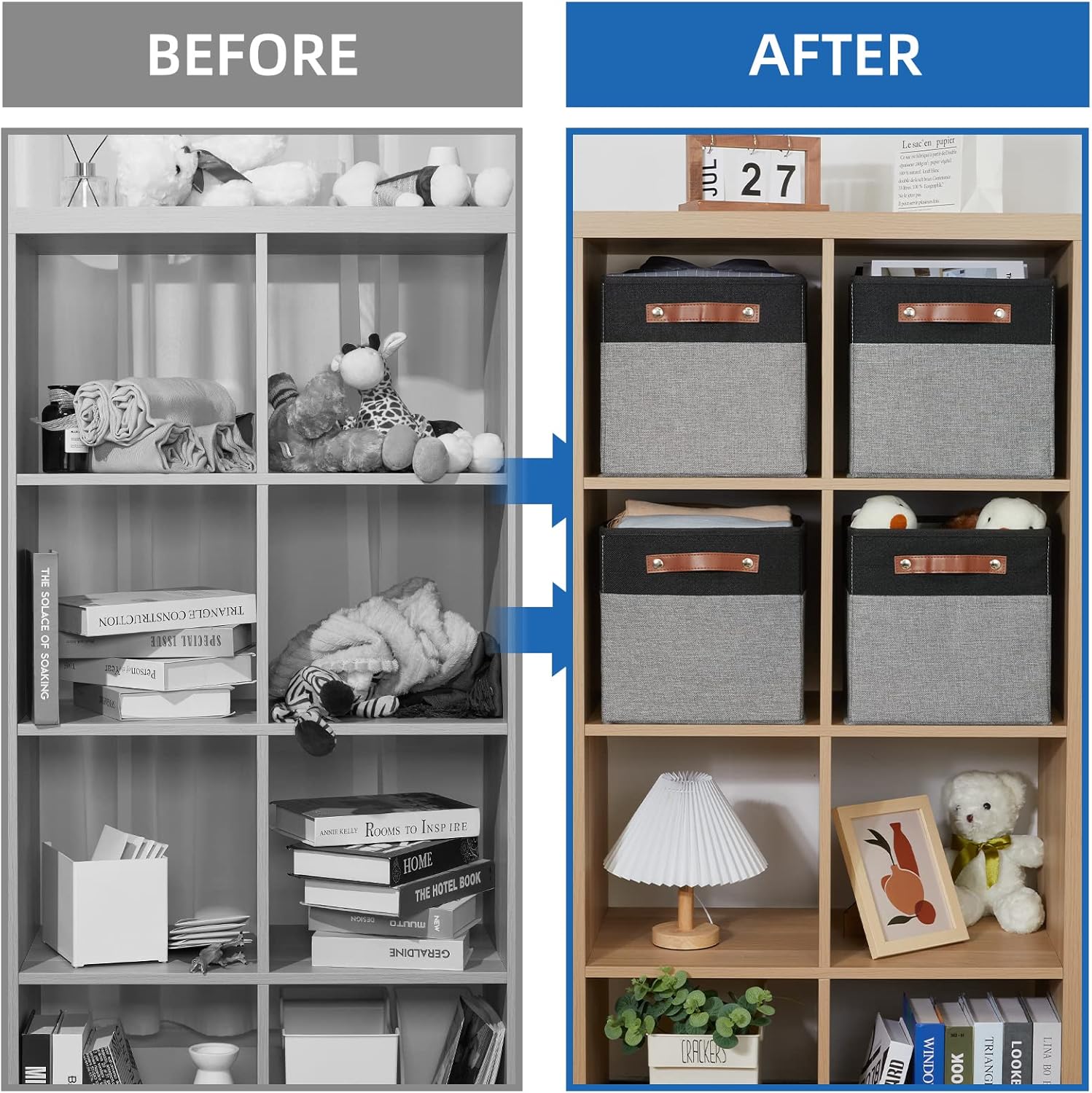 Temary 11 x 11 Cube Storage Bins Fabric Storage Cubes for Shelf, Closet, 4 Pack Cube Basket for Clothes, Storage Cube Bins with Leather Handles(Black&Grey)