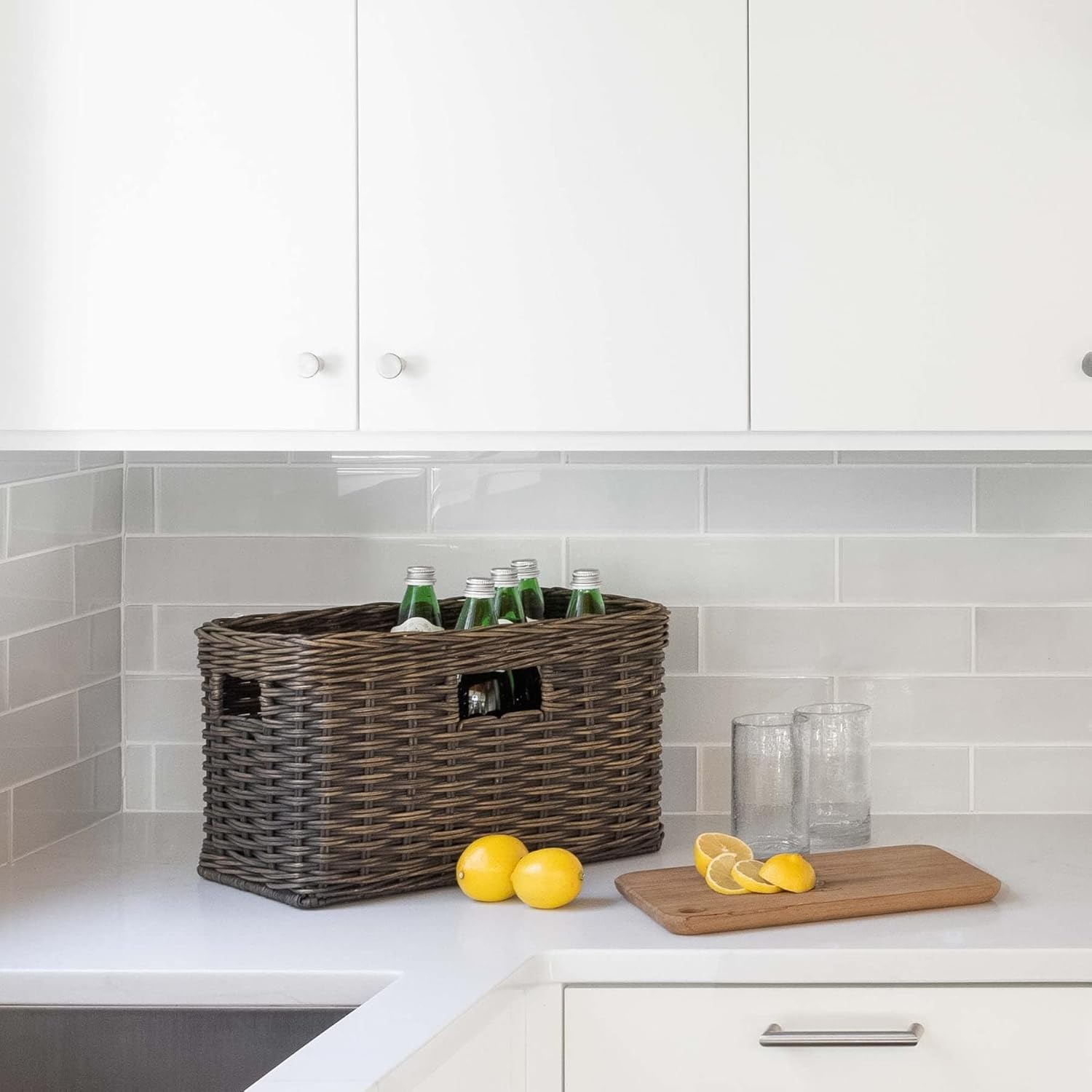 - Designed specifically to fit in kitchen cabinets or on pantry shelves, these baskets feature cut-in handles on all four sides for maximum efficiency . They are also extra deep, making them perfect as taller kitchen pantry baskets. Plus, the beautiful “two-by-two” weave means they’re attractive enough to be stored in plain sight.