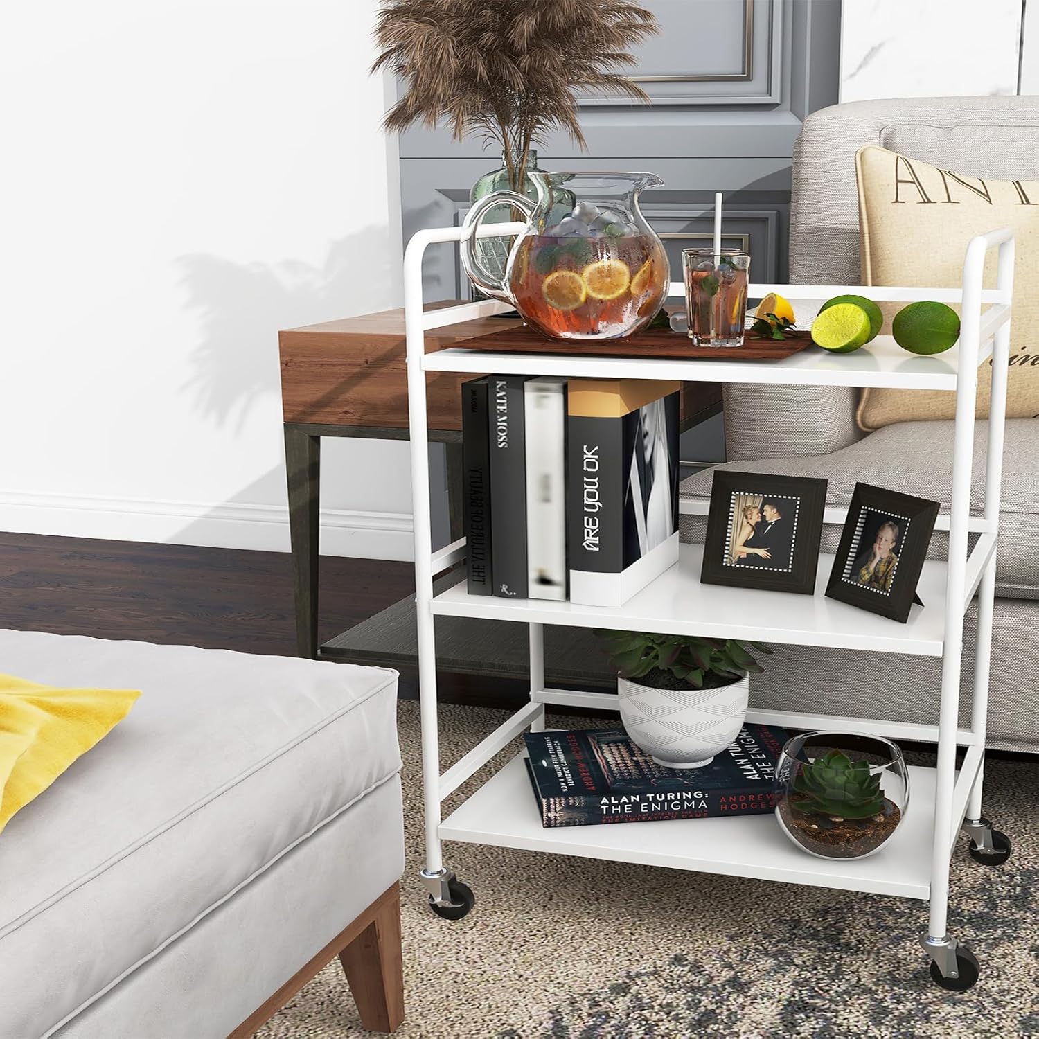 - 【Unique Design】This Three tier Rolling Cart Has A Stylish Design With Open Circular Tube Guardrails On Each Level. The Stable Construction With Three Railings Prevents Items From Falling, While The Humanized Rounded Corner Design Is Both Safer And More Attractive.