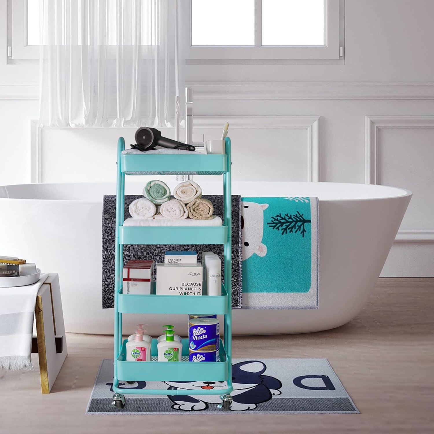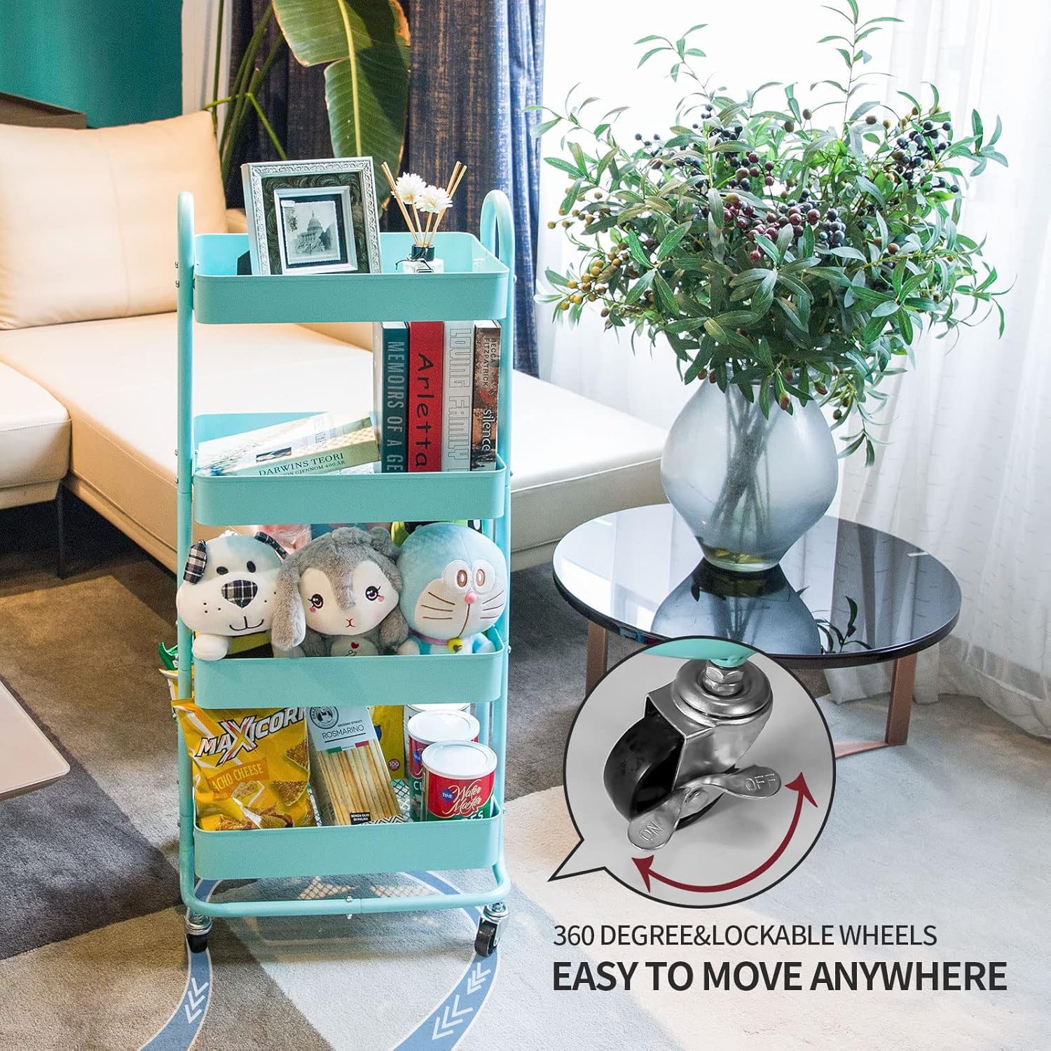 - [Multifunctional Storage Cart] This 4 tier rolling utility cart is easy to store and transport. It can be used as a tools cart, service cart, book cart, art cart, organization rack and more. Suitable for your office, bedroom, kitchen, bathroom, living room, baby room, laundry room, pantry, studio, classroom, and craft areas.