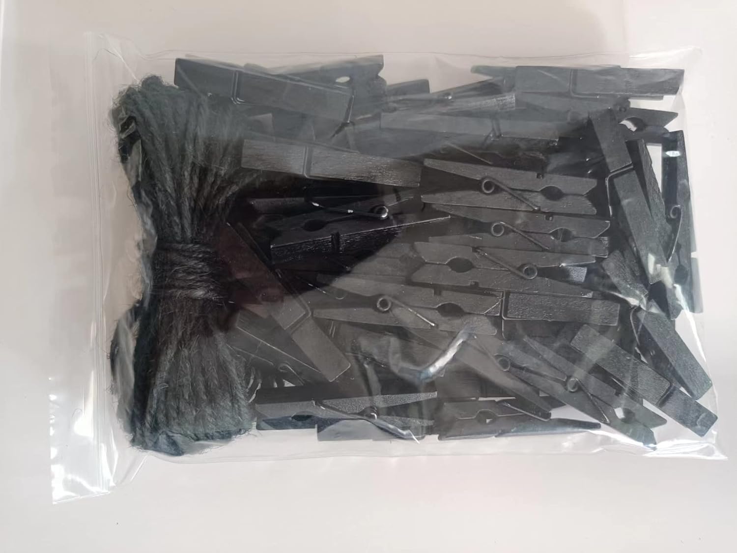 - Clothespins Set: 50 pcs black wooden clothes pins with 10 meters(33feet) black twine string to hang pictures or gift Decor