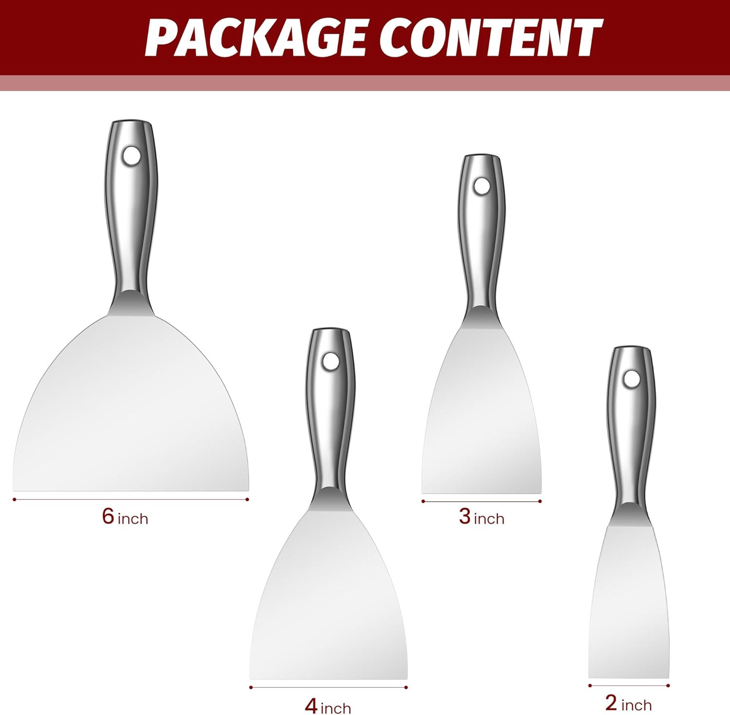 - [ALL STAINLESS STEEL]The putty knives are processed into one piece,that more solid and durable than others.Stainless-steel handle and blade ensure faster application and higher work efficiency