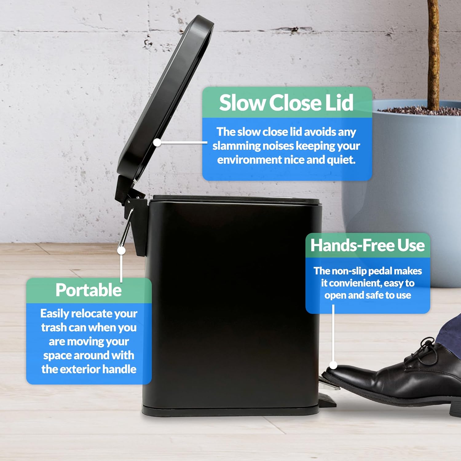 Reli. Small Trash Can with Lid, 1.3 Gallon (5 Liter) | Stainless Steel (Matte Black) | Small Bathroom Trash Can | Step Pedal Garbage Bin with Removable Bucket, Kitchen | Rectangular Metal Bin