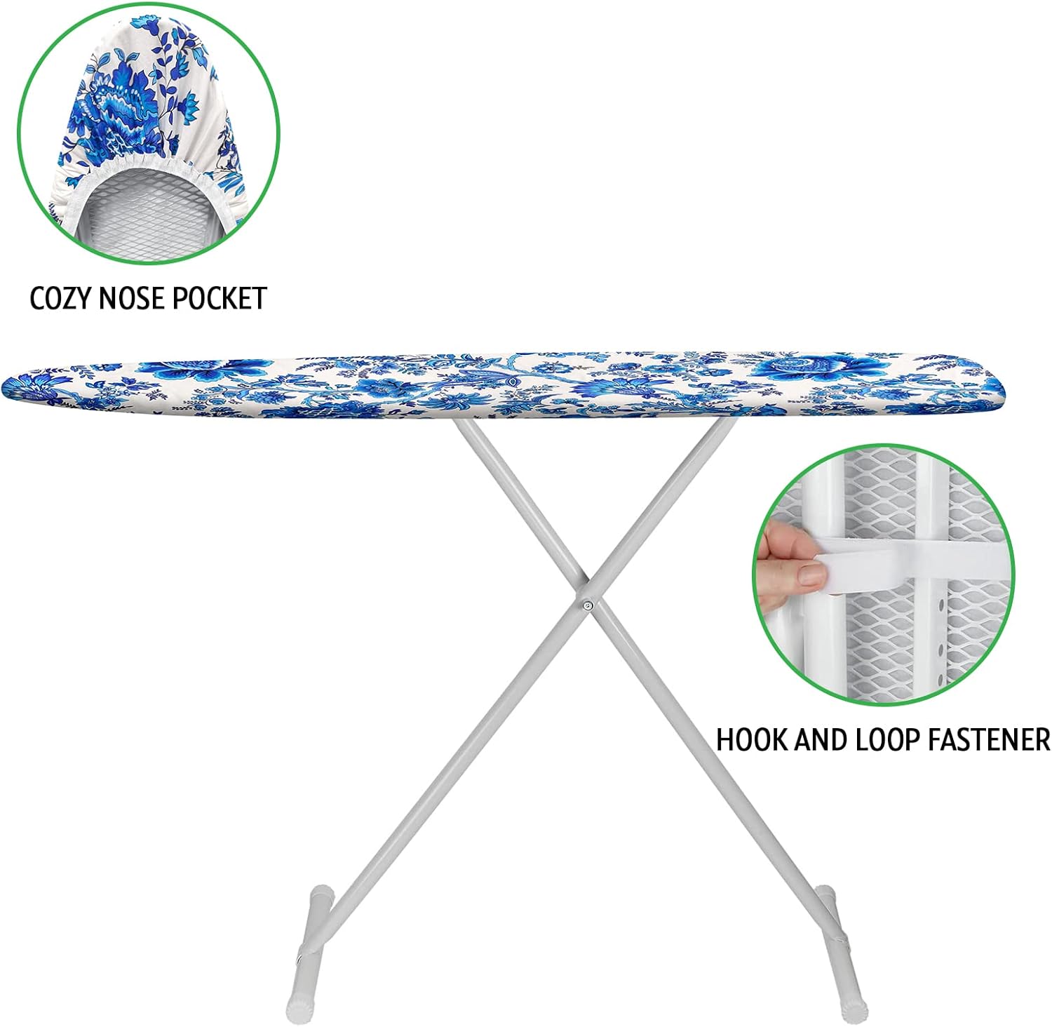 - SECURE FIT: the nose pocket design with elasticized edges and hook and loop fasteners straps ensure securely non-slip fits and keep the ironing board cover in place on standard sized ironing board. No need to worry about your ironing board covers slipping.Make your ironing chores more smooth and enjoyable