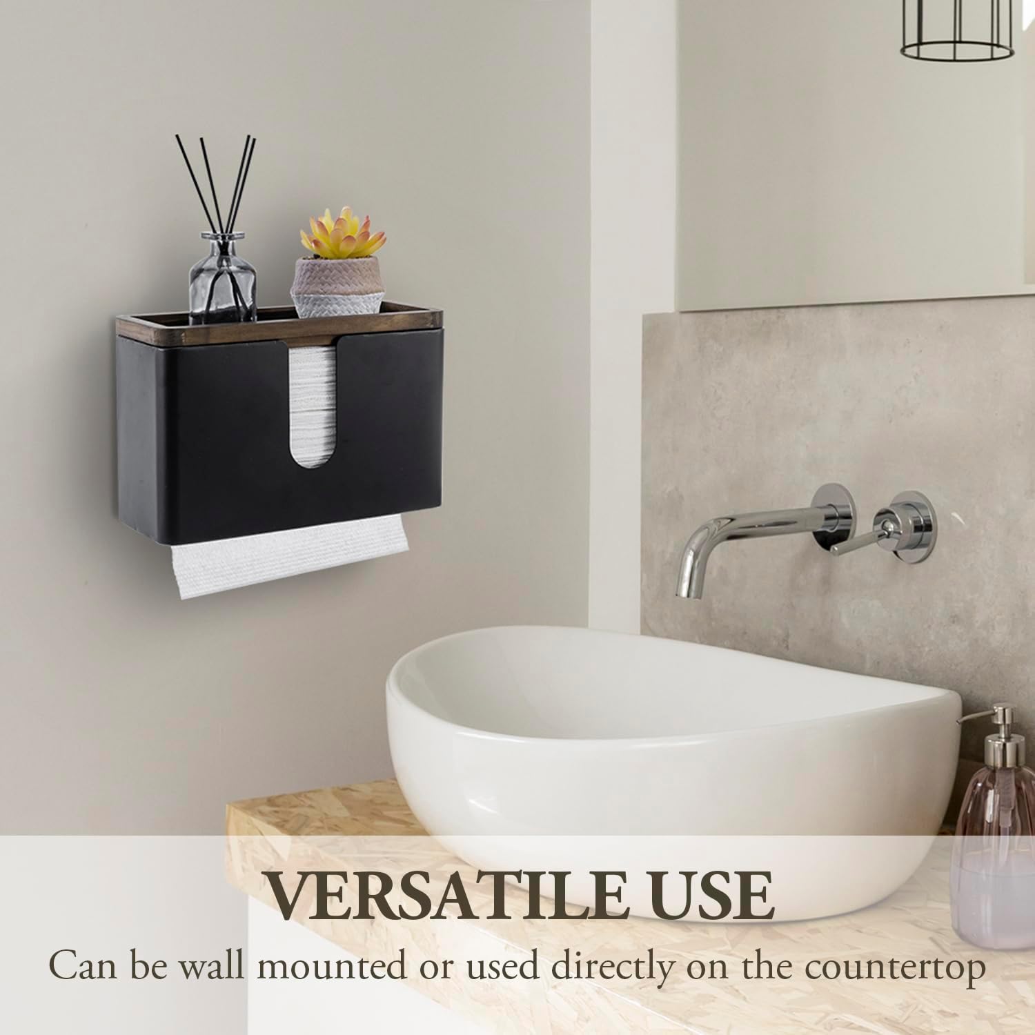- Wall mounted folded paper towel holder and wooden display tray for commercial guest use in a bathroom, kitchen, office break room, and more
