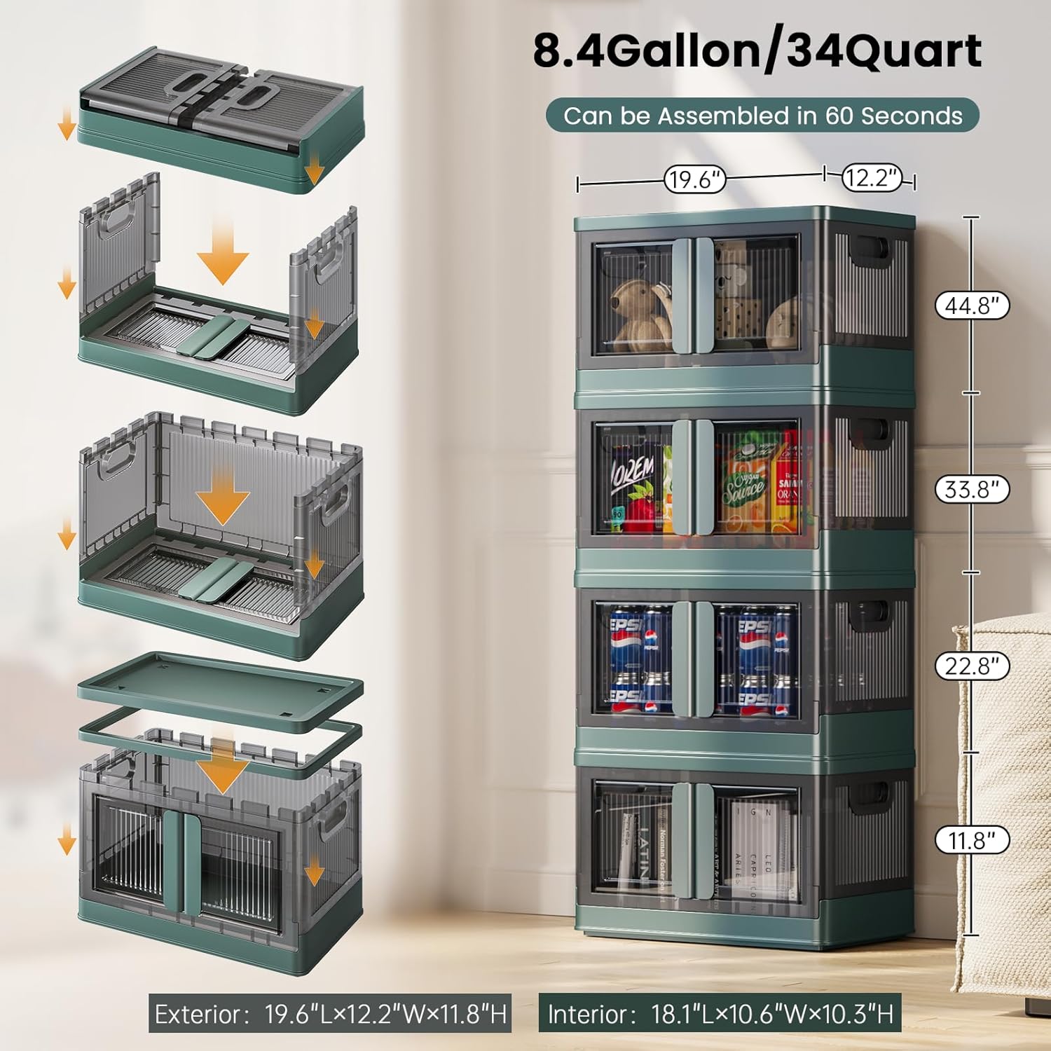 8.4Gal Collapsible Storage Bins with Lids & Wheels - 4 Pack Stackable with Doors, Heavy-Duty Plastic Containers for Home/Office, Green