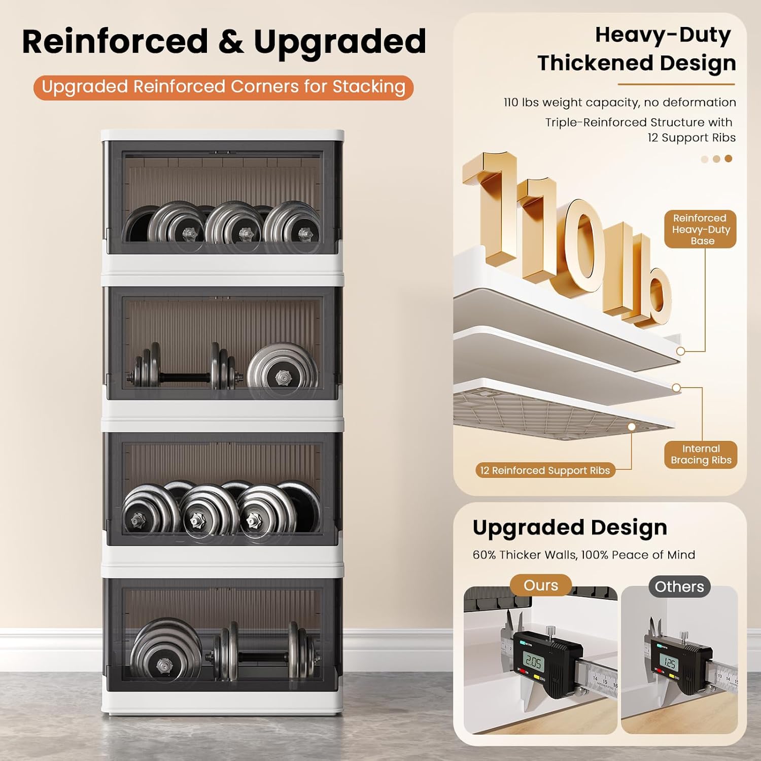 - Quick Assemble & Fold: Our storage containers can be assembled in 1 minute and folds down to 4 inches when not in use, easily tucking under beds/tight spaces—saves 80% of space. Heavy-duty PP plastic (2mm thick walls) supports 110 lbs (50 kg)/pack