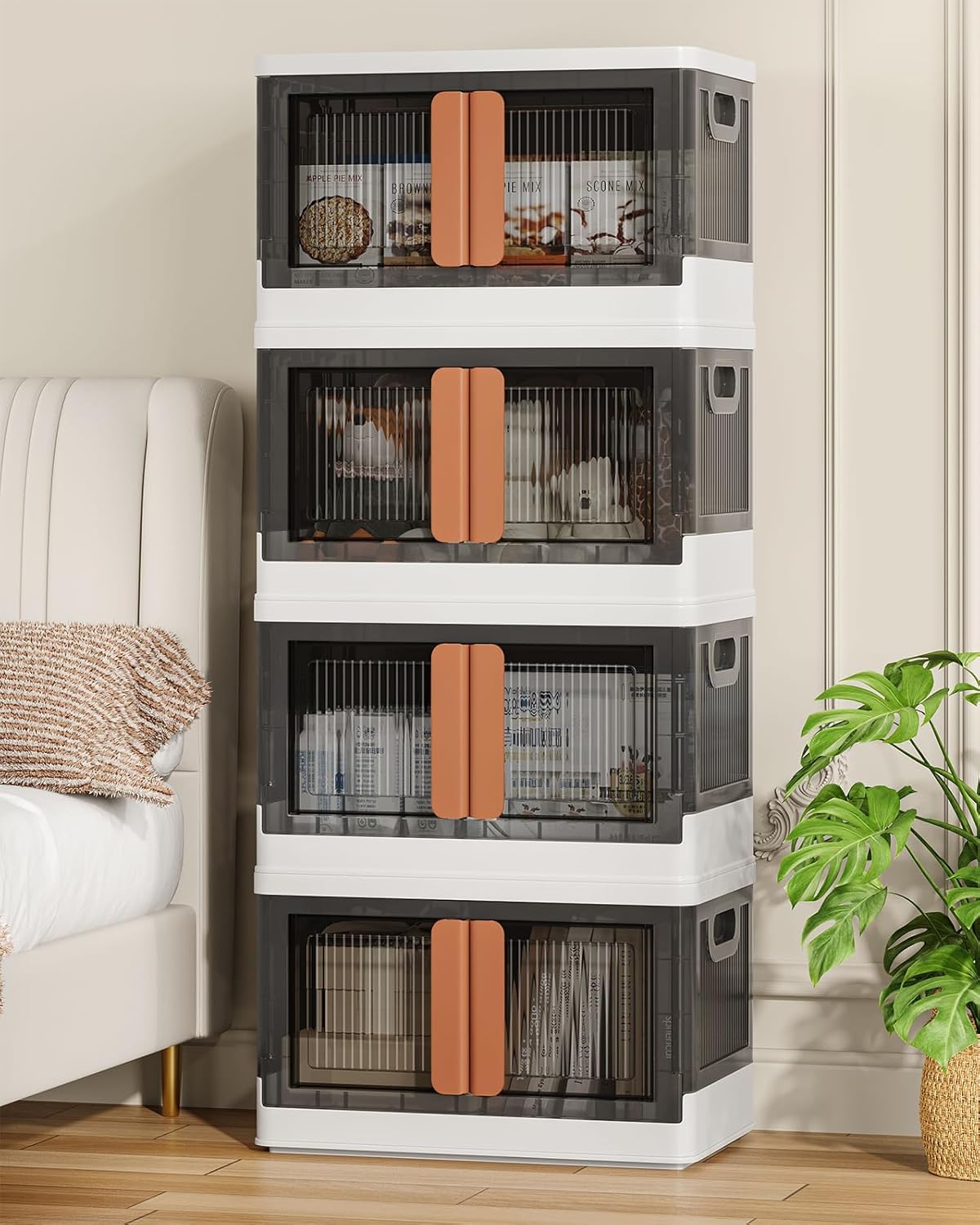 8.4Gal Collapsible Storage Bins with Lids & Wheels - 4 Pack Stackable with Doors, Heavy-Duty Plastic Containers for Home/Office, White