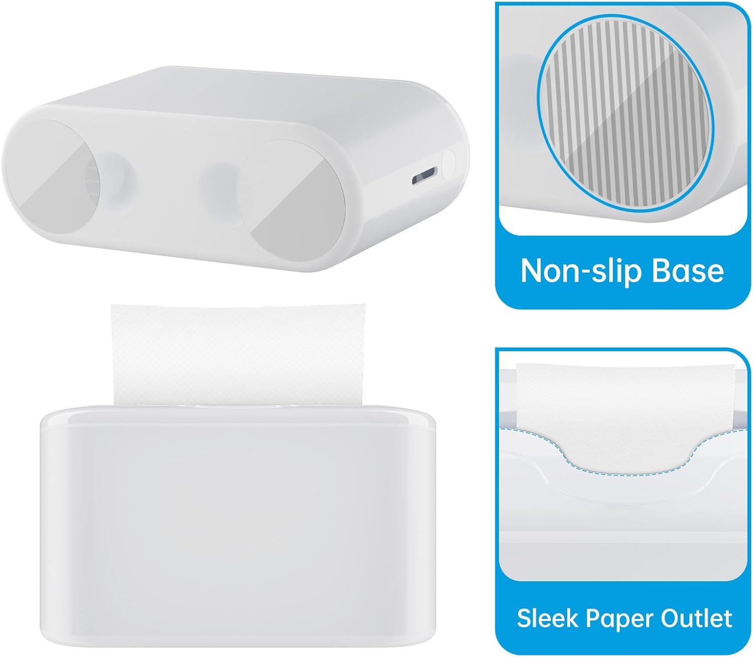 - 💎Unique Design: Our paper towel dispenser won't sliding or tipping over, for it has a non-slip bottom design(Note: the non-slip base had been pre-stick on the paper towel dispenser's base, please remove the sticker film on the non-slip base before use). And our sleek paper towel dispenser countertop own a smooth paper out mouth, compare to others hand towel dispenser won't cut the paper.