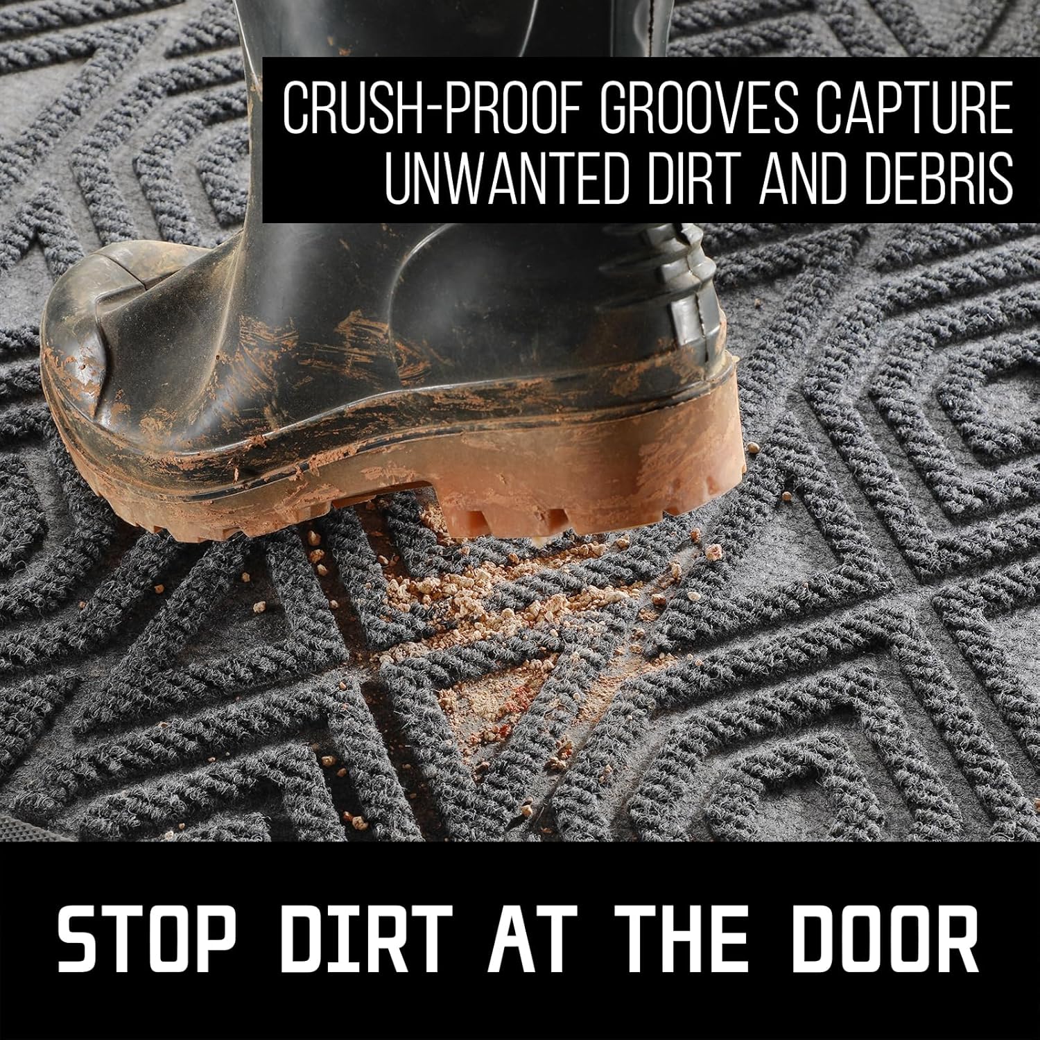 - [CAPTURE DIRT AND MOISTURE] Yimobra front door entryway mat outdoor with unique pattern design, forming a detention dam extending in all directions, helping to capture dirt, dust, gravel, mud, sand, grass or other messy debris and prevent them from entering Indoor; The surface of floor mat beautifully woven polyester fabric absorbs moisture, and the sturdy oblique rubber edge will not accumulate water in rainy and snowy days, keeping your home dry and clean
