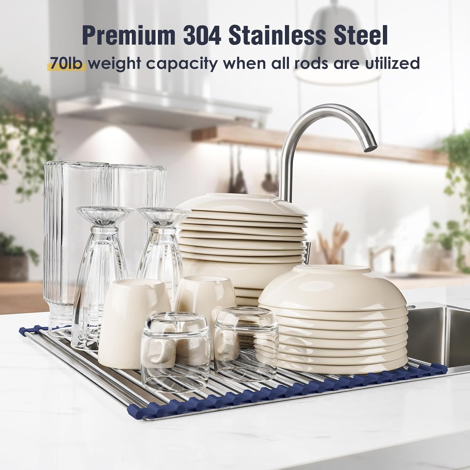 Tomorotec 17.7" x 15.5" Roll Up Dish Drying Rack Over Sink Drying Rack Sink Cover Kitchen Sink Accessories Gadget Multipurpose Organizer Foldable Stainless Steel Drainer