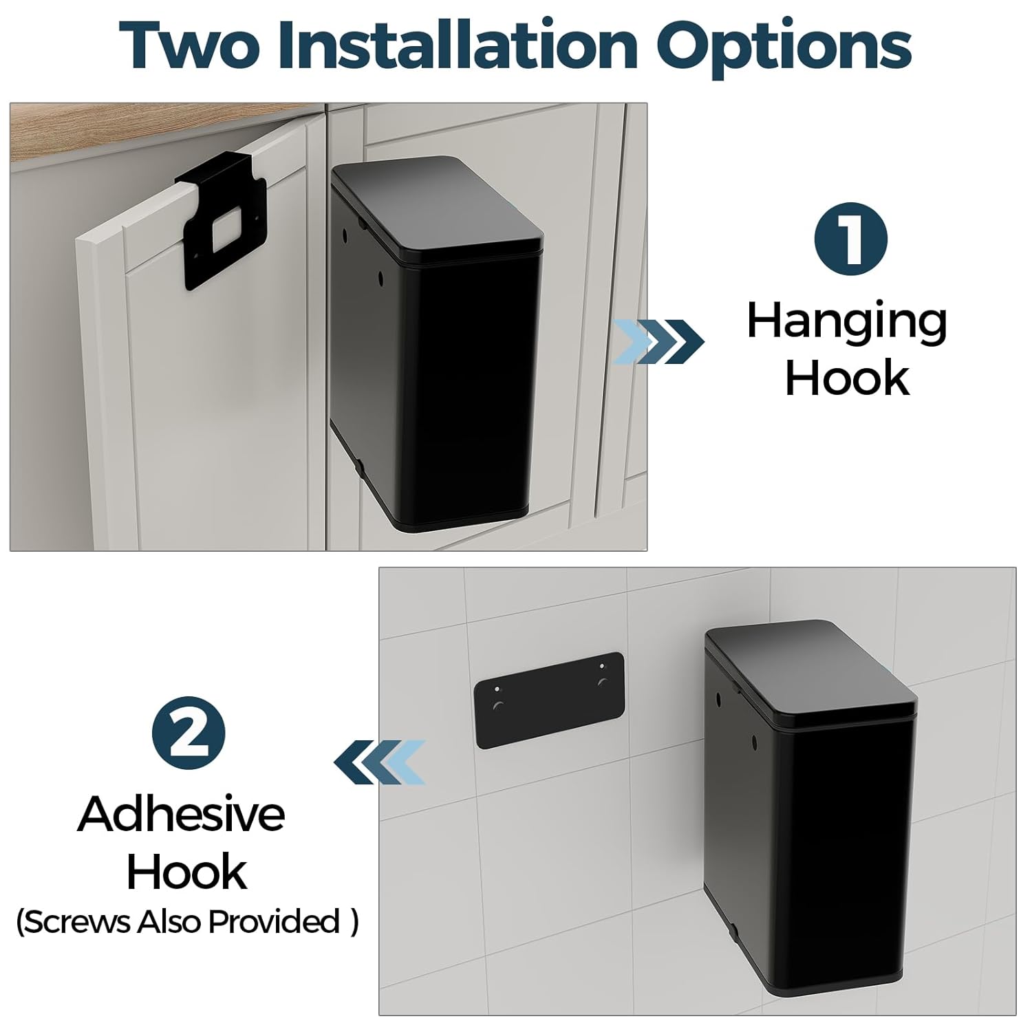 Stainless Steel Hanging Trash Can with Lid and Inner Bucket, 2 Gallon Kitchen Compost Bin for Counter Top, Under Sink or Wall Mount, Small Garbage Can for Cupboard/Bathroom/Bedroom/RV, Black