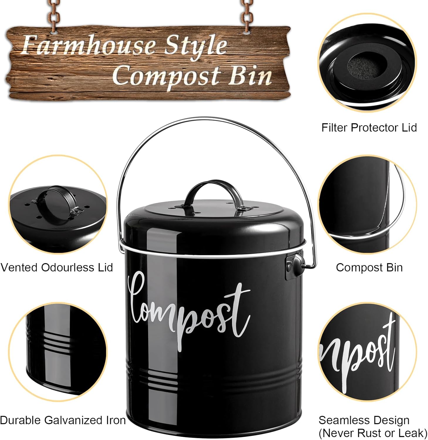Compost Bin Kitchen, 1.3 Gallon Farmhouse Kitchen Compost Bin Countertop, Indoor Countertop Compost Bucket with Lid and Charcoal Filters, Black