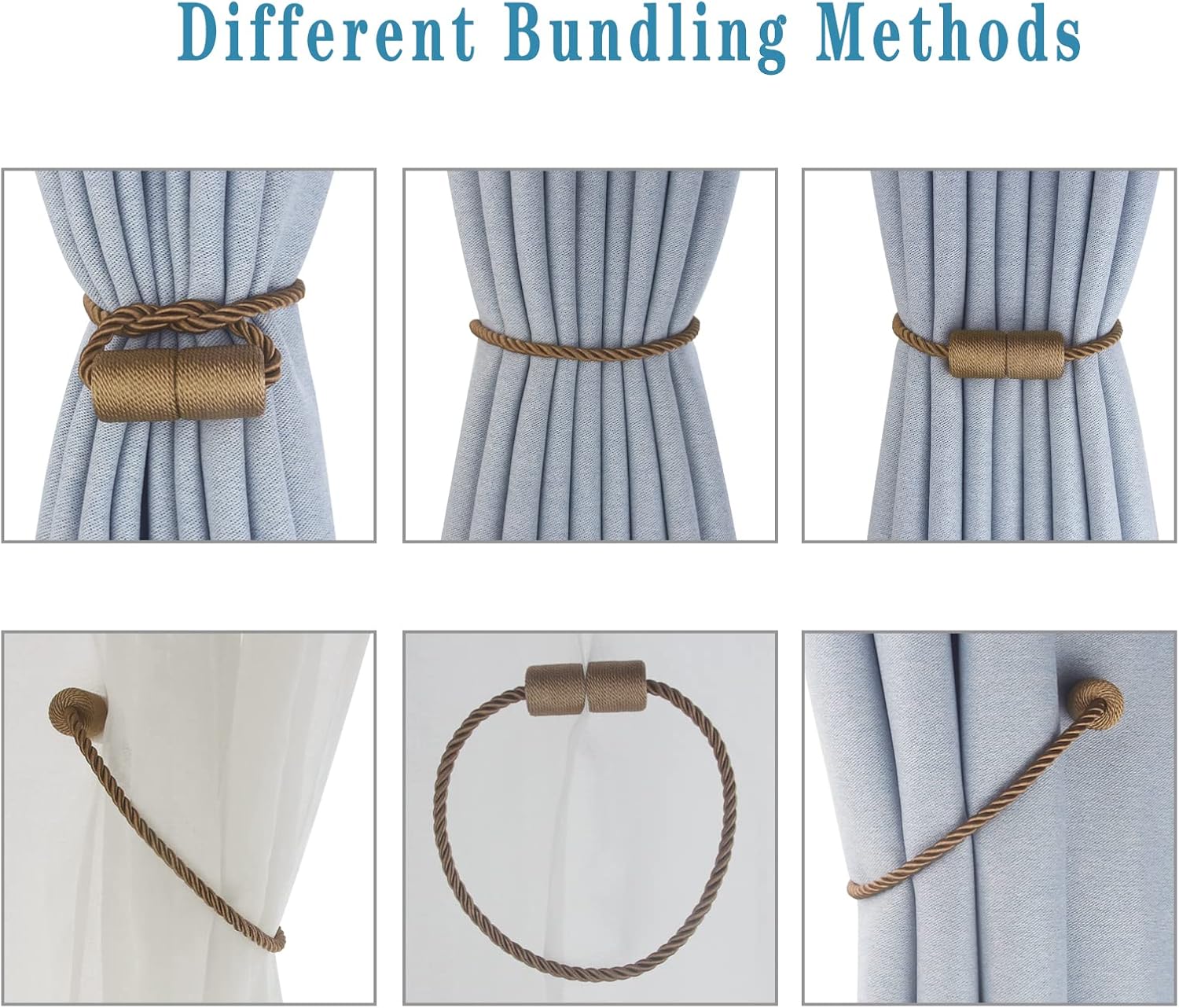 - High-Quality Materials- Magnetic curtain tie backs use an upgraded version of nickel-plated magnets, which are strong and smooth. The brightly colored twisted woven โtexture rope is hand-woven with premium polyester materials. very soft and good feeling. Beige/Gold/Black/White/Grey/Khaki/Coffee/Blue -Eight colors to choose from