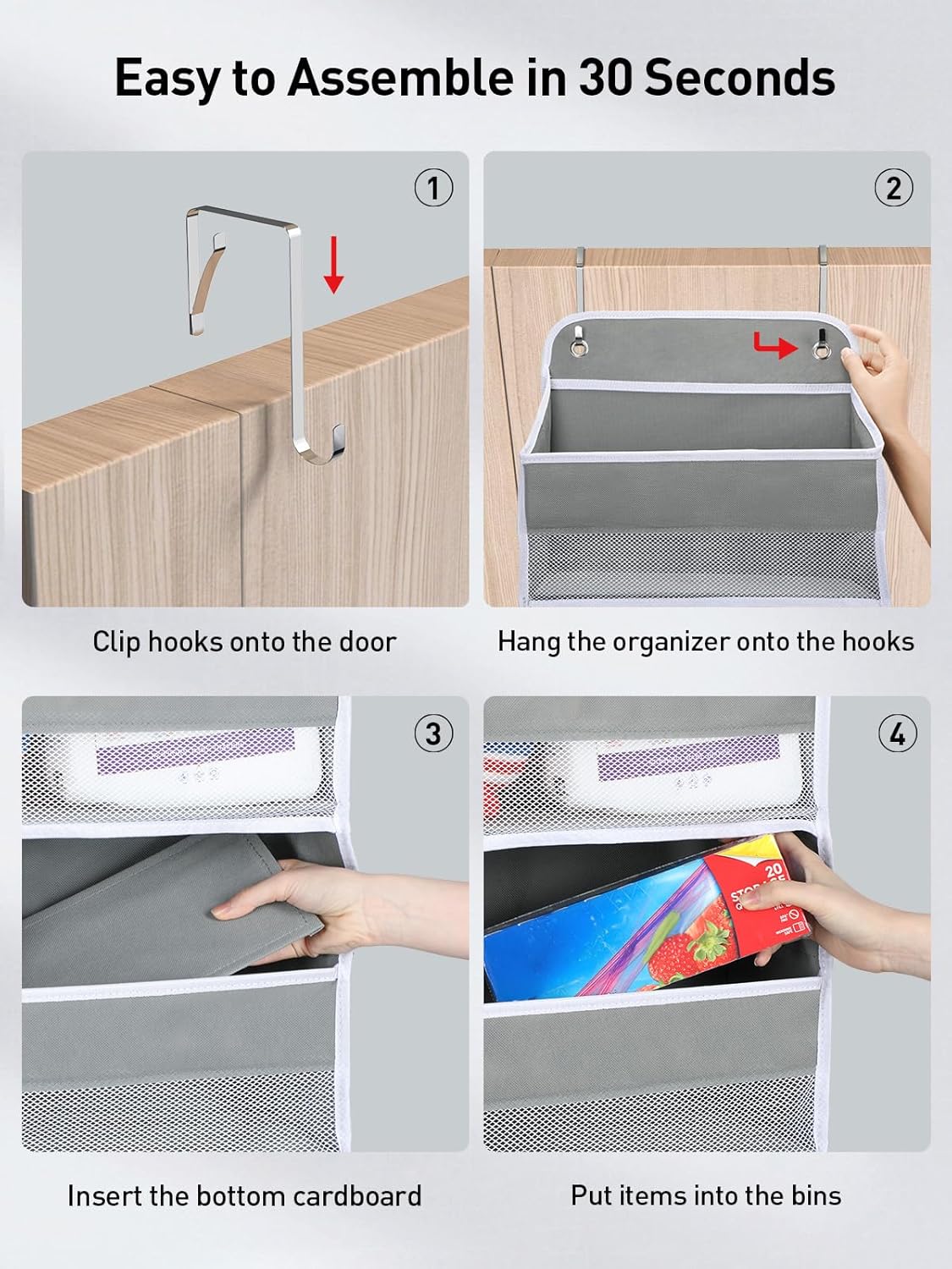 - Tool-free Assembly Within Seconds: No need to insert cardboard in the pockets as required by other bathroom storage shelves! We have it pre-inserted in the pockets to cut your hassle. Simply hang, put the cardboard in the bin's bottom, and done! Definitely a good pickup for anyone on a budget wanting to update organization and storage for extra storage