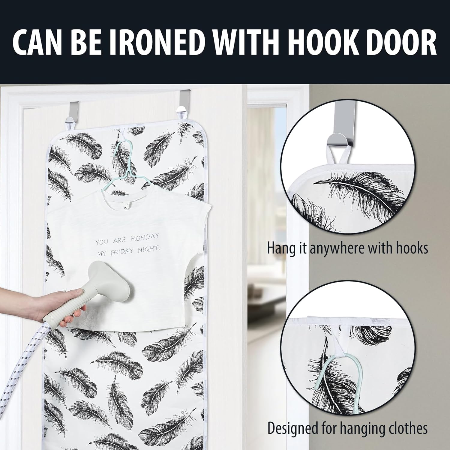- HANGING IRONING DESIGN: There has three hanging holes on this mat, two for hanging on the door or other places. The middle one is for hanging clothes. Can be used as a over the door ironing board. You are not limited on the table top for ironing. This item is good partner for steam iron. Two hooks are included