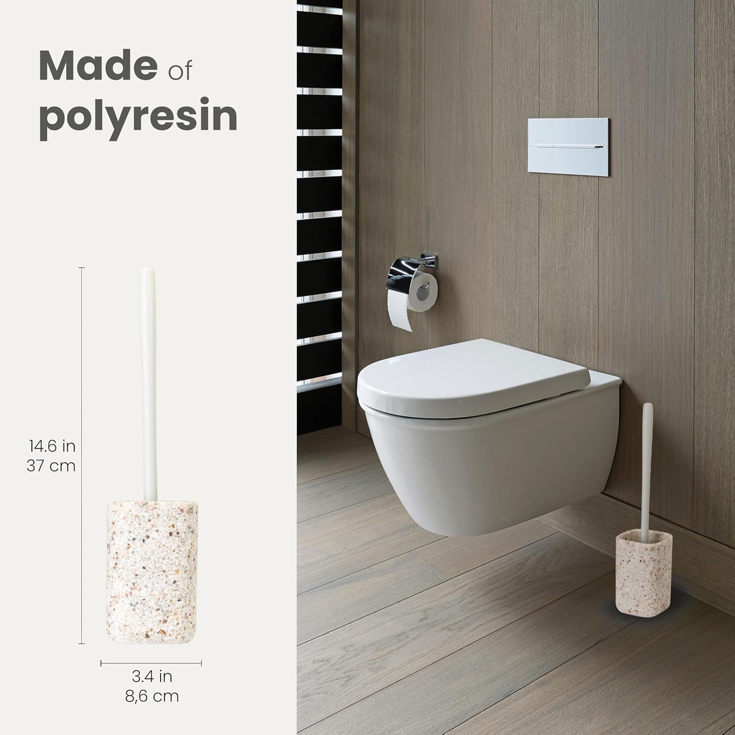 - Durable Toilet Brush: Crafted from durable polyresin with polypropylene, this toilet brush offers a warm, aesthetic look while removing stains and tough clogs. Brush refills are available through Vigar, ensuring continuous use and cleanliness.