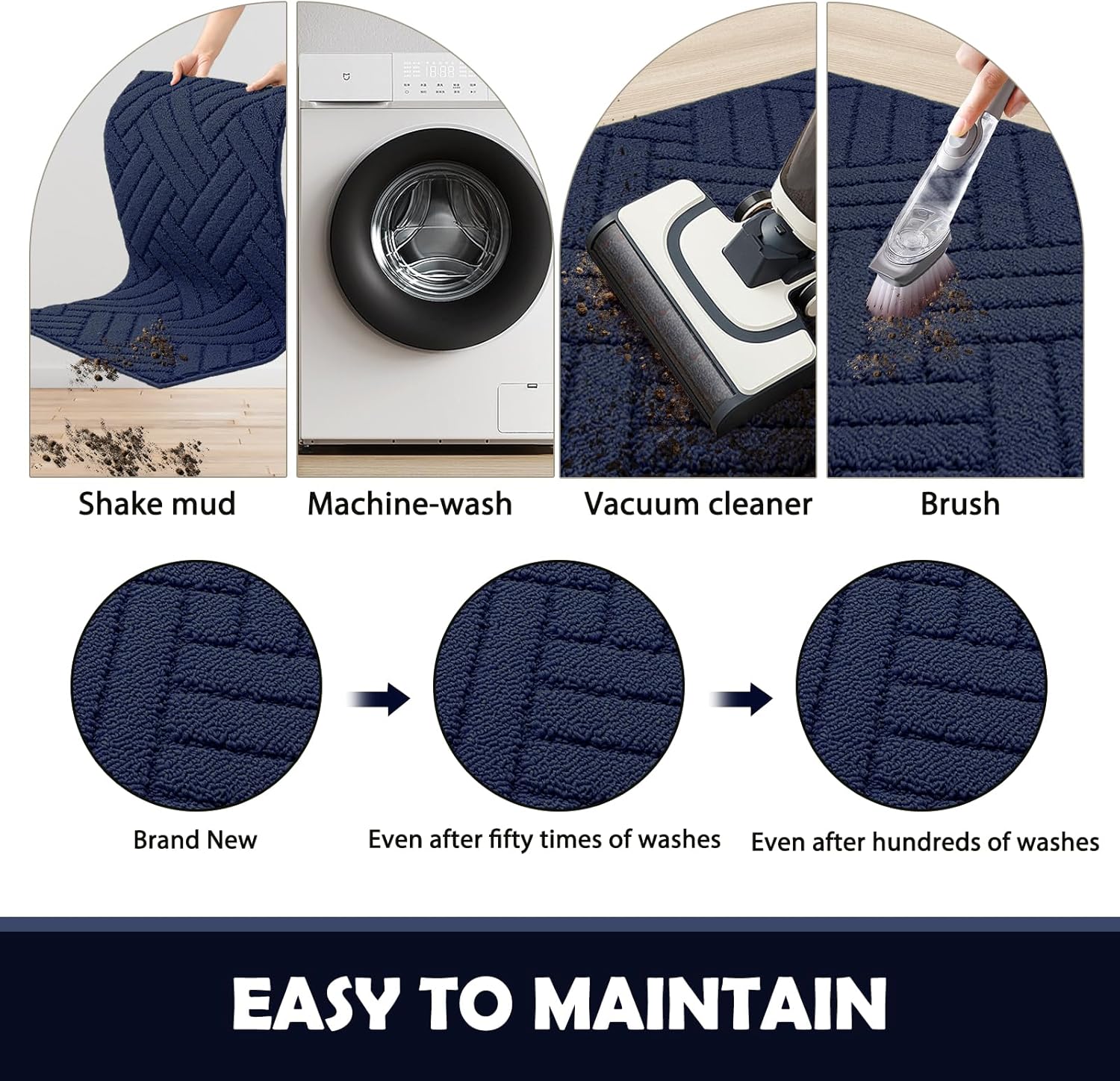 - EASY CLEAN & MAINTAIN: The unique rib fabric design removes dirt from shoes easily. When your doormat gets dirty, first shake it off outdoors or over your garbage bins, then sweep with a broom or vacuum regularly or use a garden hose to rinse the mat outdoors. For a deeper clean, machine washed and dried are available. We recommend rinsing it under the cold water. Please clean with mild soap and do no use bleach