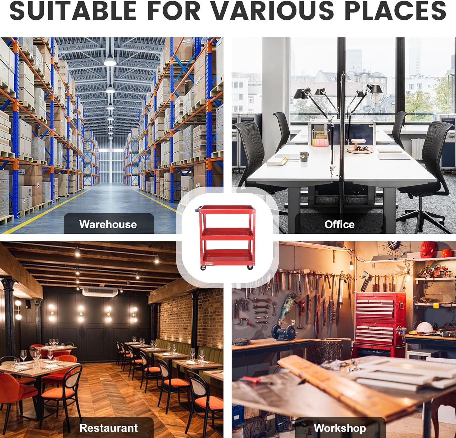 - 【Versatile Utility Cart】Our Commercial Rolling Tool Cart is constructed with versatile design, which can be utilized in various occasions, such as warehouses, home, office, restaurant, workshop, garage, repair shops etc. With the humanized handle and rolling wheels, you can move it everywhere.