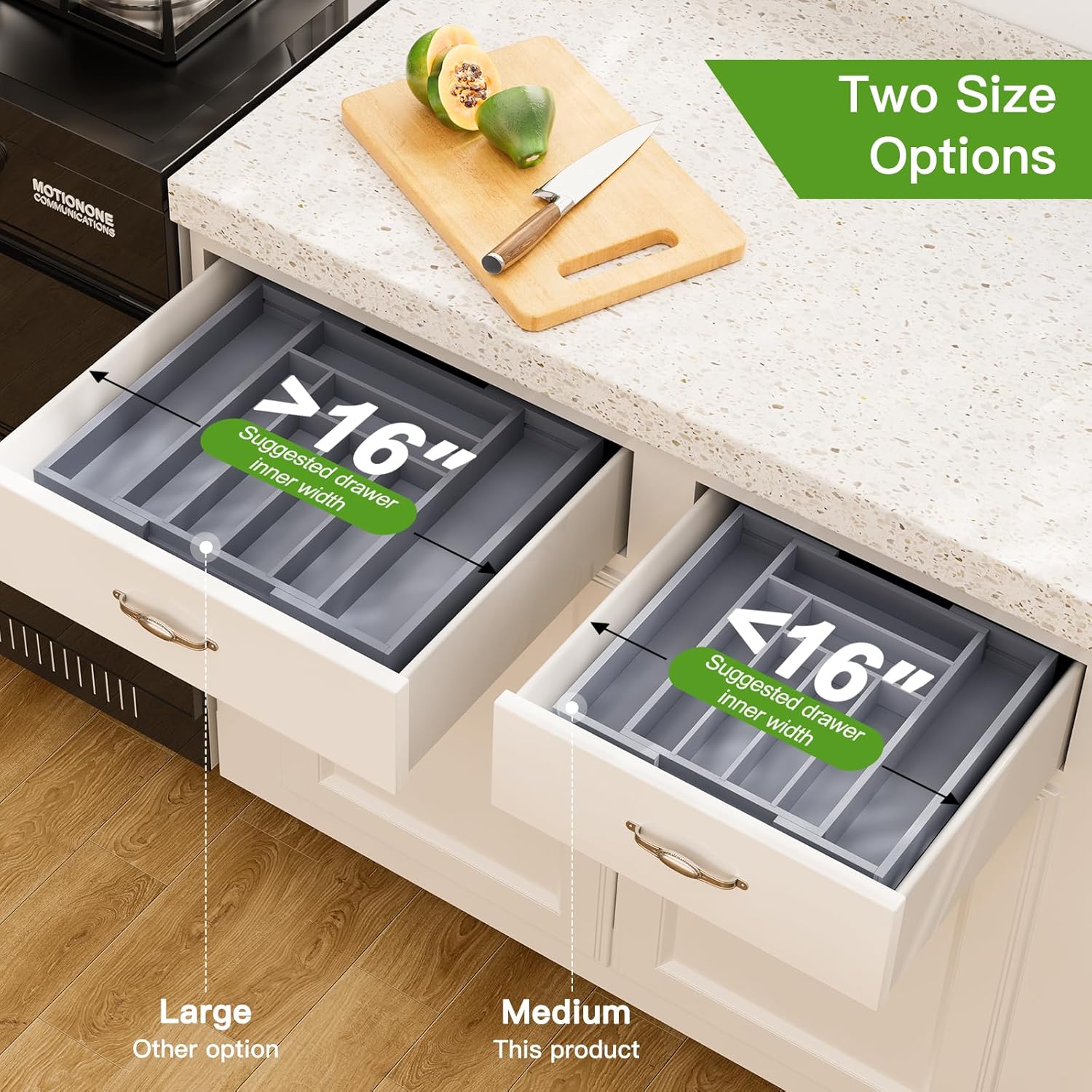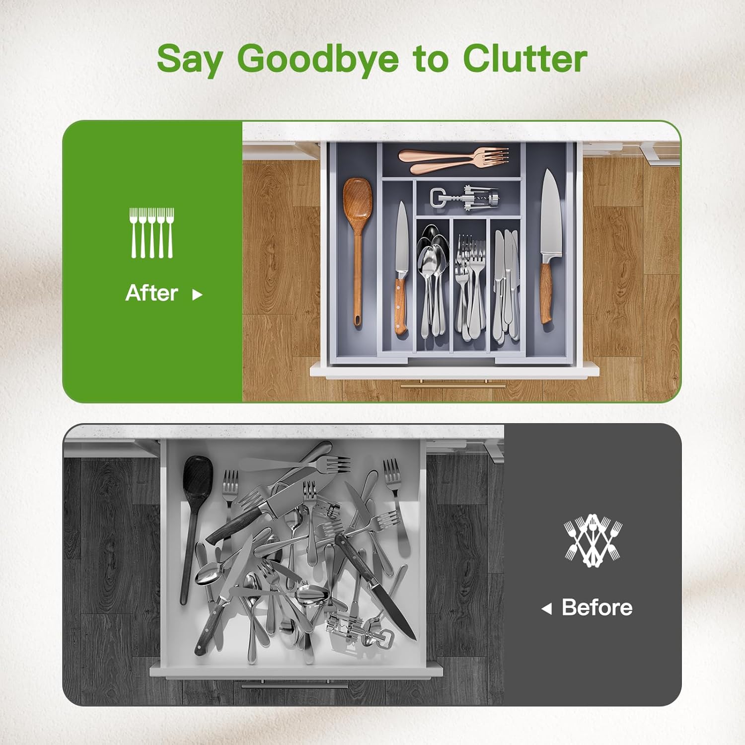 - Expandable and Adjustable Utensil Organizer: Designed with 6-8 compartments, the silverware organizer can save space while accommodating multiple items, which is expandable from 10.31 inches to 16.54 inches wide with smooth sliding.