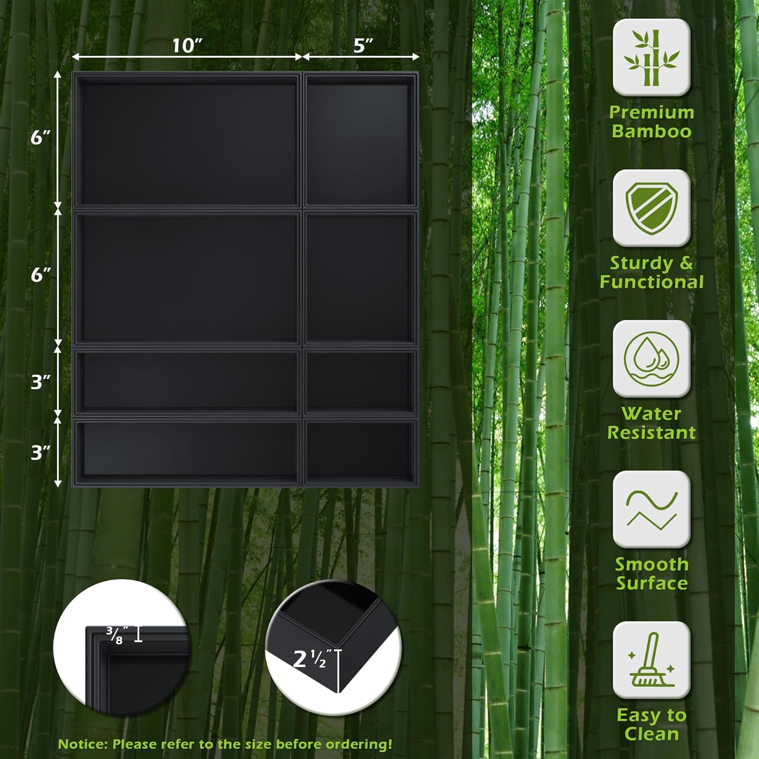 - Elegant 8 PCS Black Drawer Organizer - Greatseas black silverware organizer set is made of bamboo, and the bottom is made from engineered wood board, which is more stable, durable & food-safe than plastic material. These bamboo drawer organizers with delicate workmanship, makes excellent details and ultra-smooth hands feel without worrying about pricking your hands