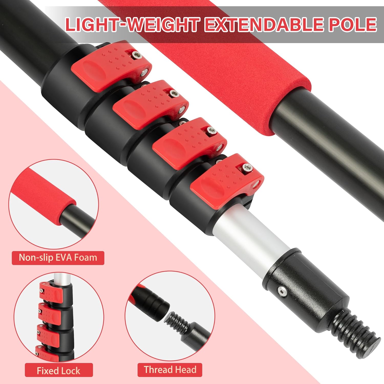 - Freely Adjustable Length: 4-stage adjustable extendable pole with lock buttons, easily extend telescopic rod to desired length and secure pole with the lock buttons, 30 feet high reach to clean spider webs up to 3rd floor outdoor.